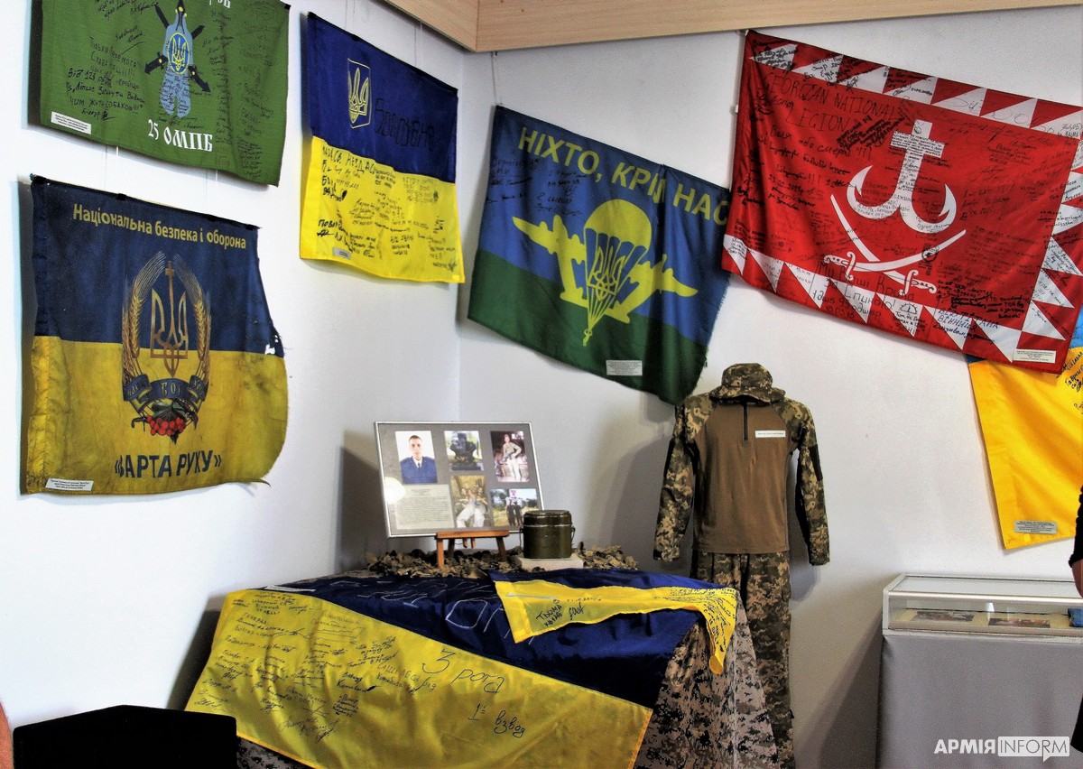 На виставці представлено прапори різних військових з’єднань і формувань, у складі яких вінничани із 2014-го боронять рідну землю. Це і 63-та окрема механізована бригада, 128-ма окрема гірсько-штурмова бригада, 57-ма окрема мотопіхотна, зведений загін ПС ЗСУ «Дика качка» тощо. Крім того, зібрані прапори з підписами бійців 120-ї та 109-ї окремих бригад територіальної оборони, 28-ї окремої механізованої бригади, 72-ї окремої механізованої бригади, 59-го військового мобільного госпіталю та зведених загонів Міністерства внутрішніх справ.