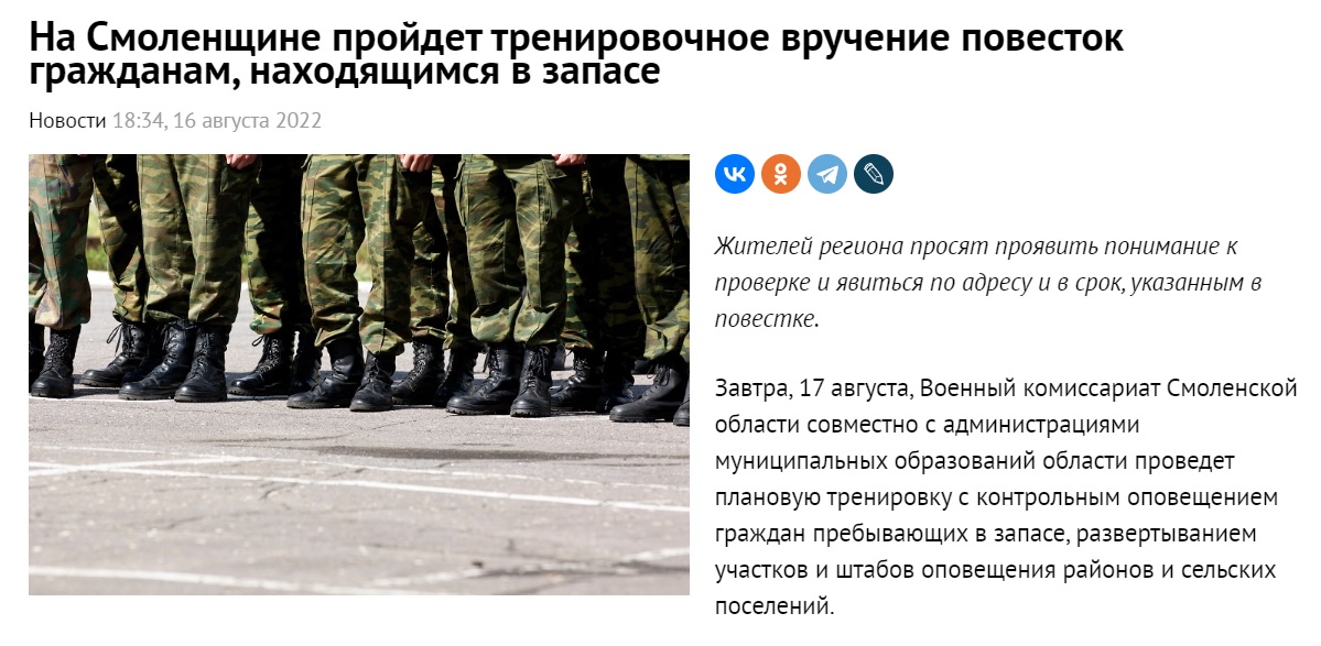 Ряд місцевих ЗМІ смоленської області, що на росії, написали про те, що місцевий військовий комісаріат збирається провести «тренувальне вручення повісток резервістам». Деталі не надавались, окрім того, що майбутнім «двухсотикам», які отримають повістку, треба «поставитись з розумінням» і з’явитись за адресою та у поставлені строки «для уточнення персональних даних». У найкращих традиціях країни-фейку офіційна причина – перевірка можливостей російських військкоматів згуртовувати російське м’ясо в одну велику фрикадельку, назвати її ротою і відправити вмирати за путінські палаци з аквадискотекою. Наша мобілізація – не мобілізація, на війну, яка не війна, а спецоперація з демілітаризації та денацифікації, але денацифікація