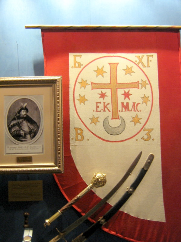 Так, найдавніший із відомих гетьманських прапорів пов’язаний з ім’ям Богдана Хмельницького. Він мав білий колір — традиційний та найбільш поширений серед самостійних володарів. Периметром полотнище було оздоблене рудувато-червоною лиштвою. Центр його займало коло, у середині якого було зображено хрест над півмісяцем. Належність прапора гетьману засвідчували розміщені в кутах полотнища ініціали гетьмана та абревіатура гетьманського титулу.