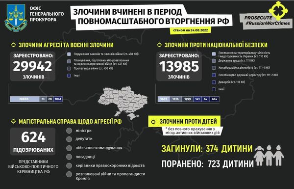 Офіс Генерального прокурора України станом на 24 серпня задокументував 29 942 злочини окупантів, вчинених у період широкомасштабного вторгнення рф.