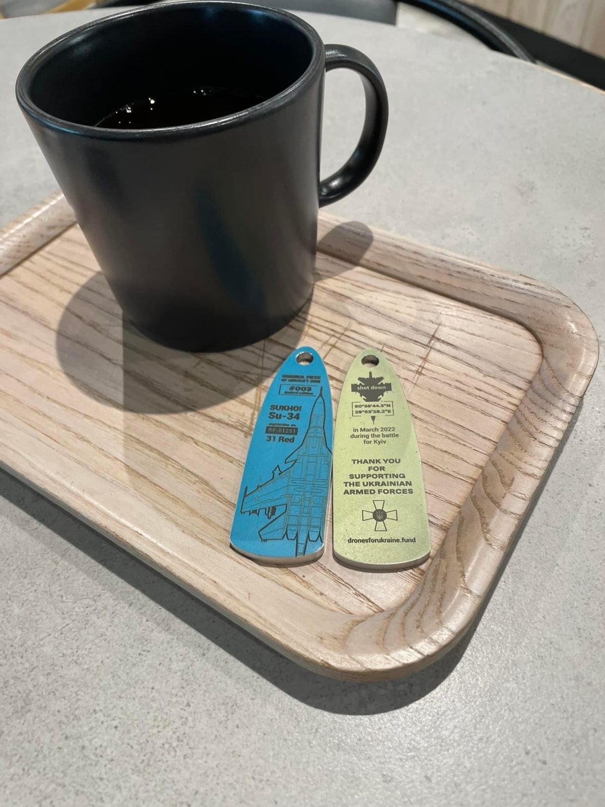 – Кожен брелок має унікальний номер та напис англійською мовою: «Дякуємо, що підтримуєте Збройні Сили України». Також брелоки супроводжуються підкладкою з написом: «Зроблено в росії та перероблено в Україні», картою Київської області, зображенням скульптури Батьківщини-Матері й інформацією про літак. Так, на мій погляд, виглядає більш презентабельно.