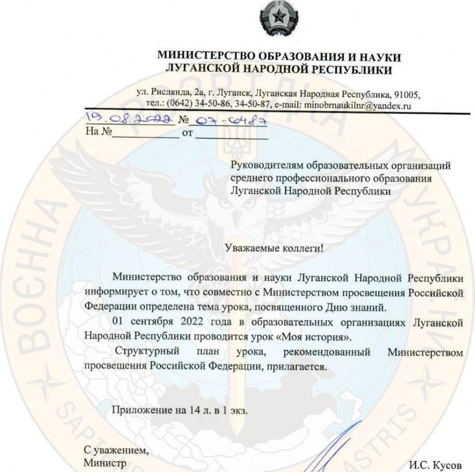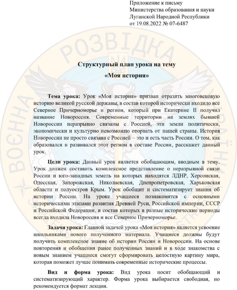 Рашисти з так званої «лнр» підготували до 1 вересня розлогий багатосторінковий документ під назвою «Структурний план уроку на тему «Моя історія»». Планується, що саме з нього почнеться навчання школярів на тимчасово окупованих територіях в новому учбовому році.