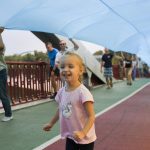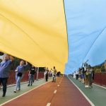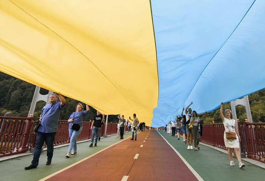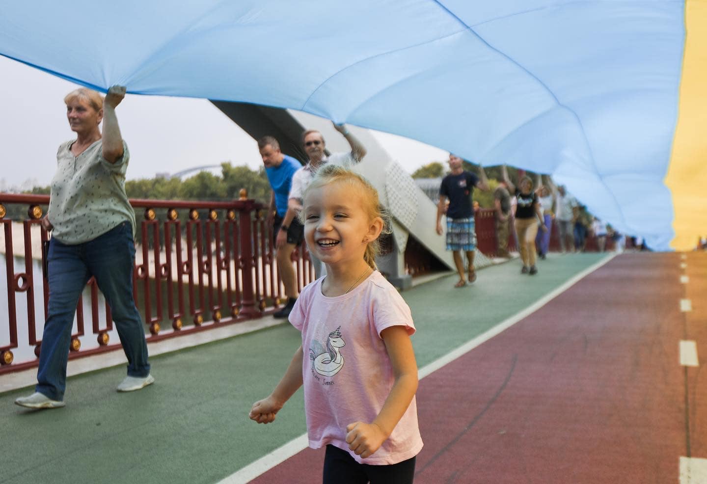 Український стяг довжиною 430 метрів розгорнули через Парковий пішохідний міст на Труханів острів у Києві.