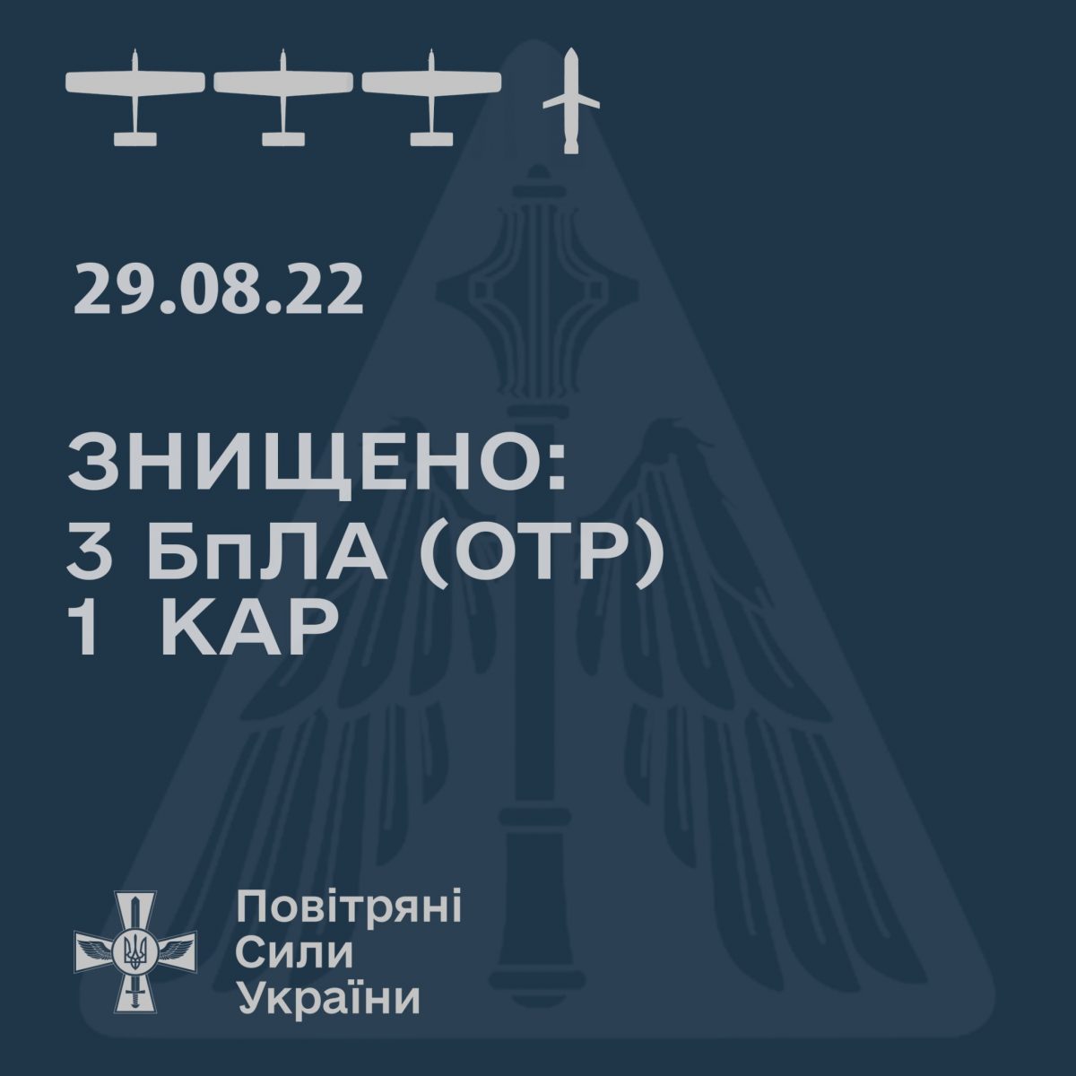 Авіація Повітряних Сил продовжує знищувати окупантів. Протягом минулої доби, 29 серпня, винищувальною, штурмовою та бомбардувальною авіацією завдано ударів по пунктах постачання ПММ, складах боєприпасів, бойовій броньованій техніці та живій силі противника. Всього здійснено понад 15 групових авіаційних ударів по окупантах і засобах ППО.