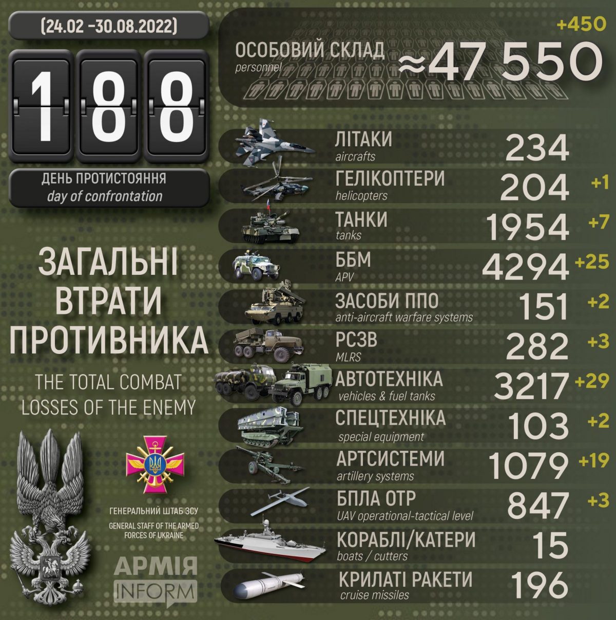Загальні бойові втрати противника з 24.02 по 30.08 орієнтовно становлять: