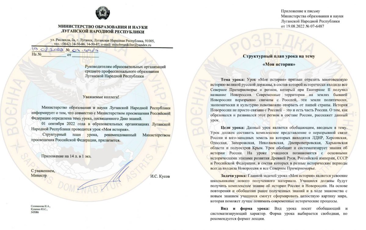 Підготували російські окупанти спеціальні методичні розробки і для обробки українських дітей з початком нового навчального року. Одна з них має назву «Структурний план уроку на тему «Моя історія». Цей «план» «являє собою традиційну солянку псевдоісторичних фактів та божевільних ідей. Він практично дослівно повторює пропагандистські виступи російських телевізійних ідеологів: Україну створив лєнін, української мови не існує, всі українські герої — злочинці, Україну має бути знищено, повідомляє Головне управління розвідки Міністерства оборони України.