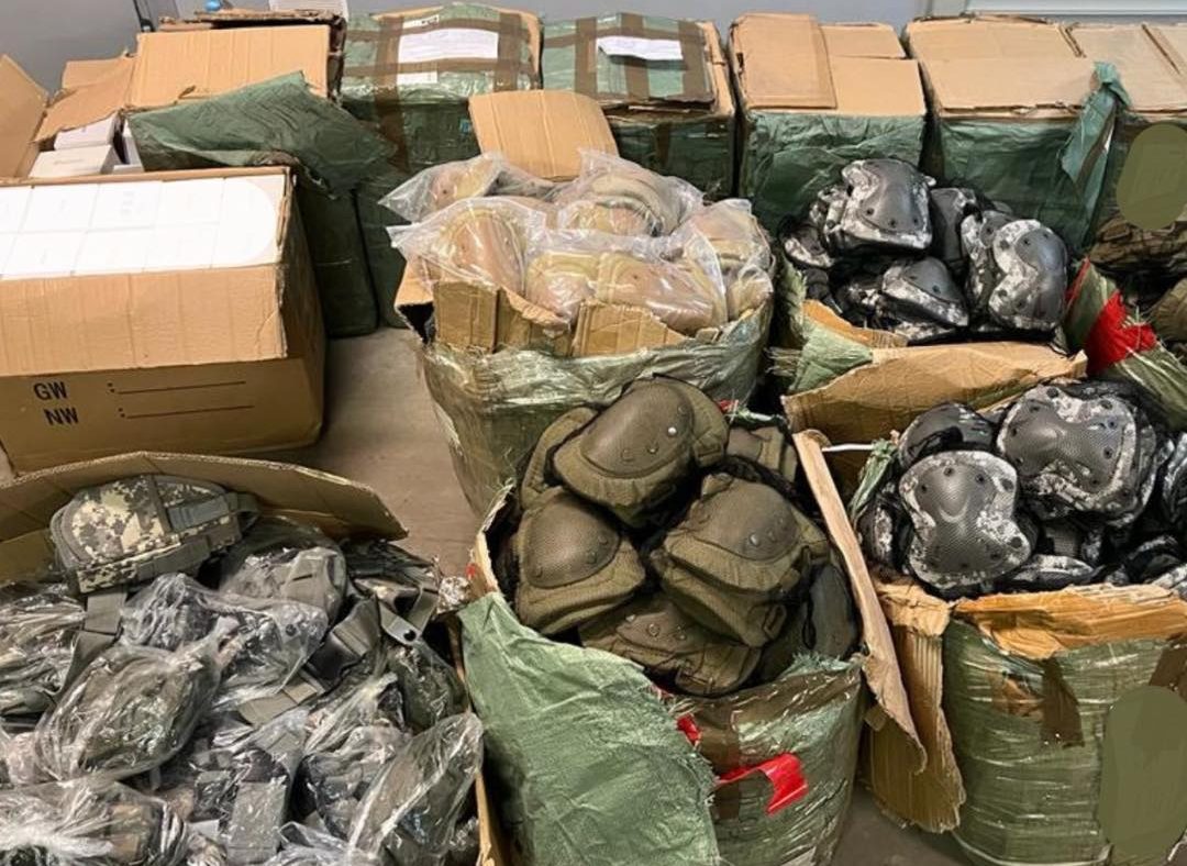 Захисна амуніція та інші товари були вилучені під час обшуків приміщень у м. Києві. Їх використовували зловмисники, які організували протиправну схему постачання на територію України товарів військового призначення та подвійного використання.
