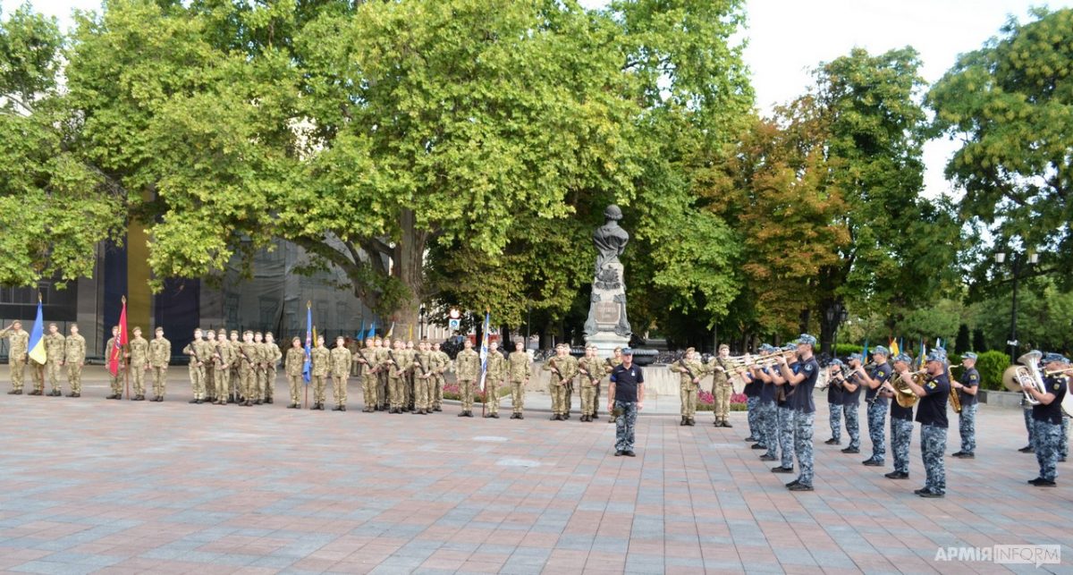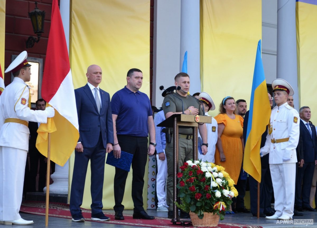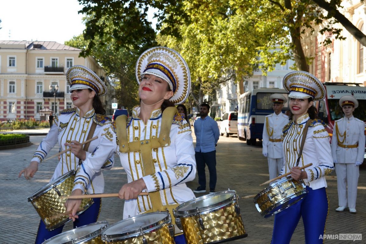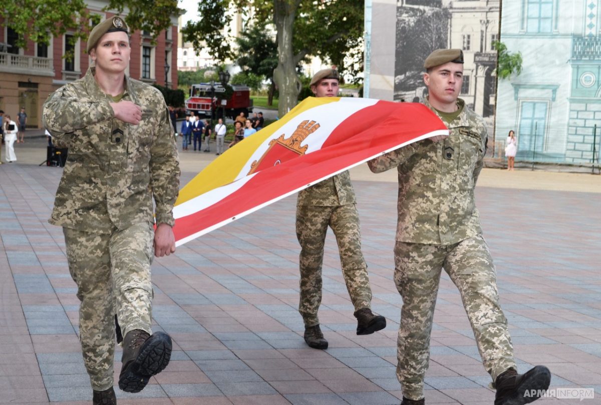 За сталою традицією, після цього на флагштоку, встановленому біля будівлі міської мерії, під акомпанемент оркестру Центру військово-музичного мистецтва ВМС ЗС України військовослужбовцями було піднято полотнище міста-героя Одеси, яке майорить поруч із Прапорами України та Євросоюзу.