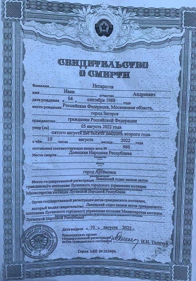 Видання The Insider розповіло історію 34-річного Івана Непаратова, знищеного українськими захисниками 5 серпня у місті Артемівськ Донецької області. Причина смерті – «вогнепальне вибухове уламкове наскрізне поранення голови».