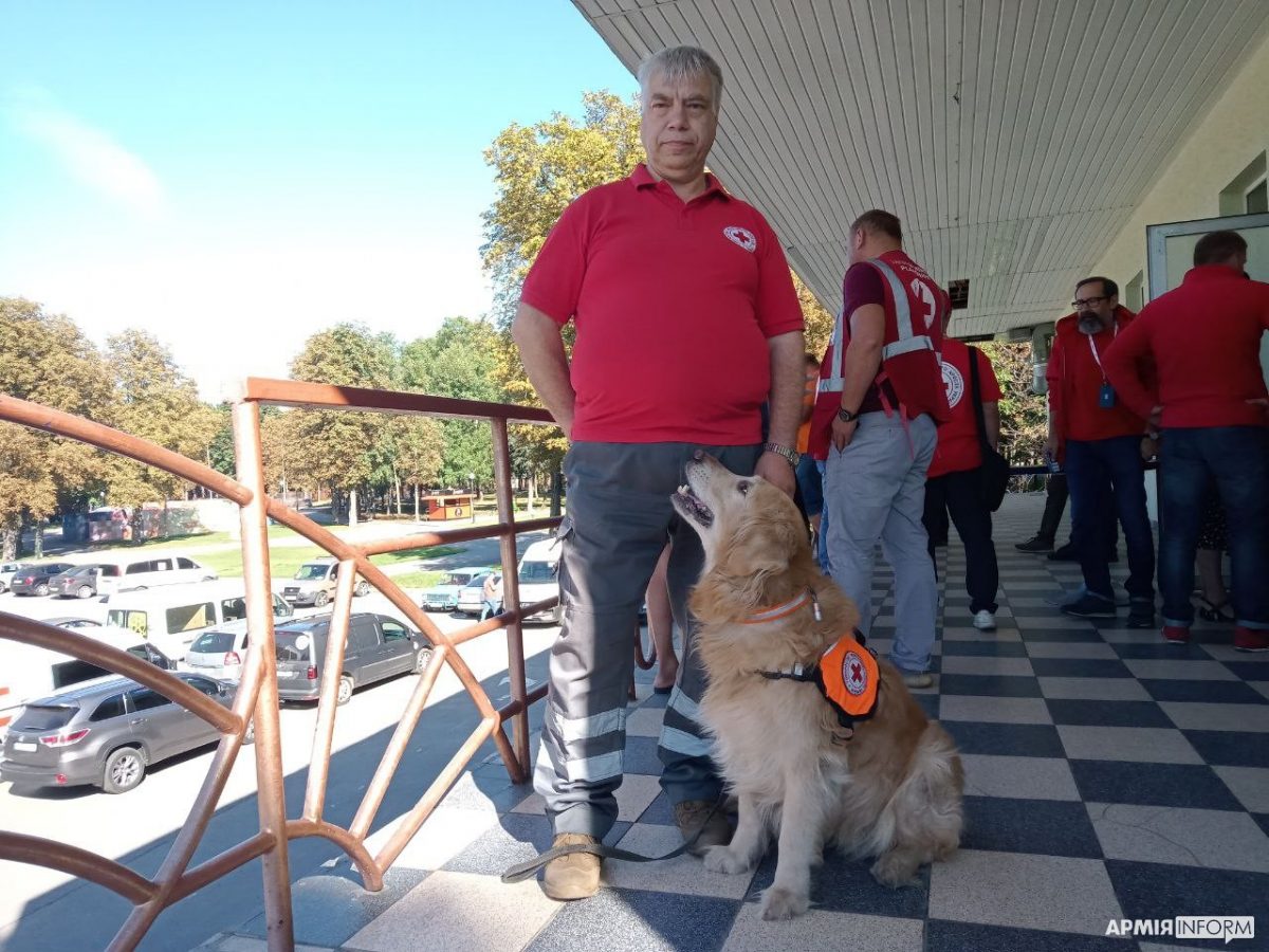 Під час розмови з Денисом нашу увагу привертає чоловік, який стоїть неподалік та тримає на повідку золотистого ретривера. Обидва одягнуті в уніформу товариства — Ігор у червоній футболці, пес Антей — в попоні з логотипом Червоного хреста.
