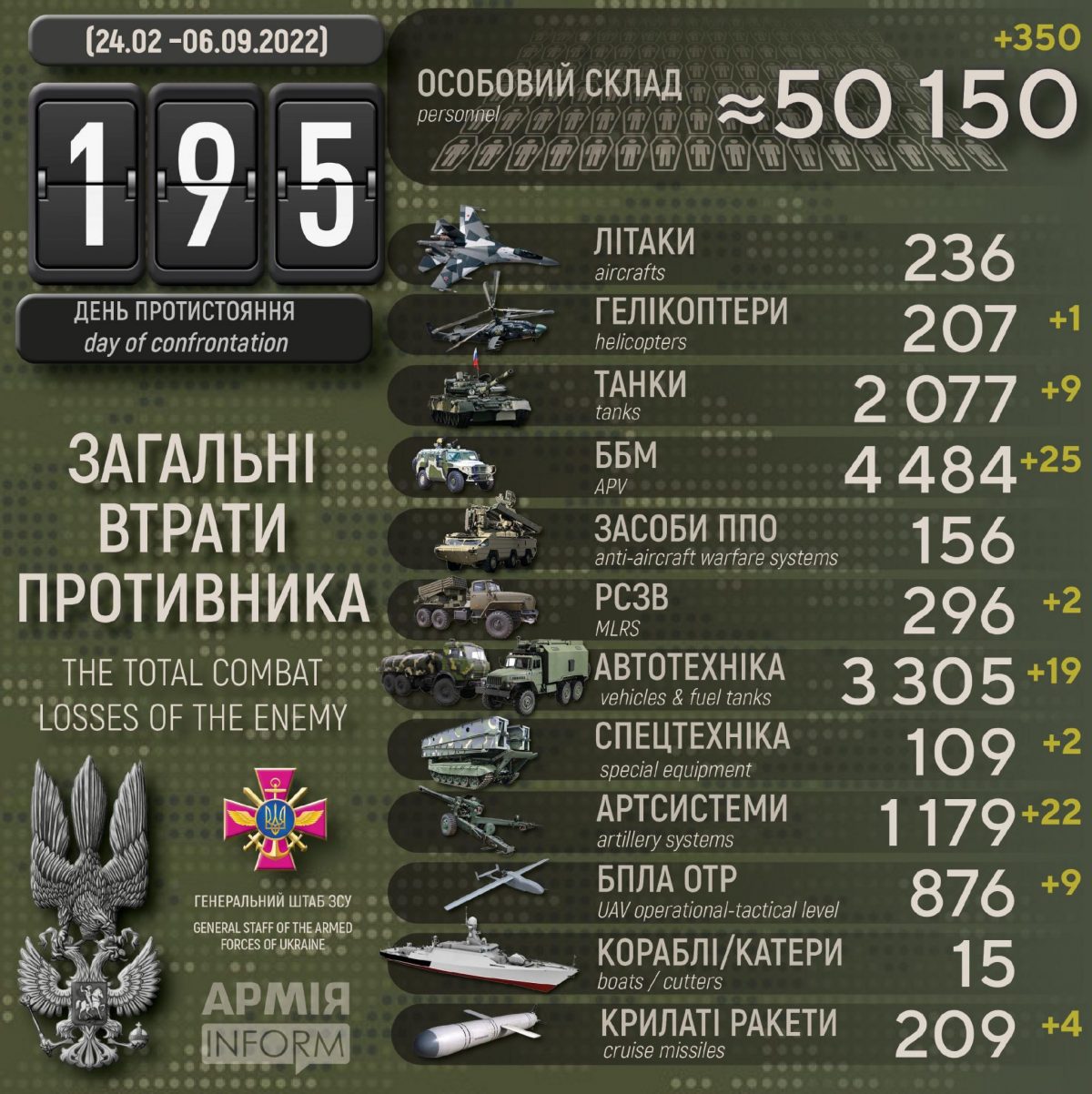 Загальні бойові втрати противника з 24.02 по 06.09 орієнтовно становлять: