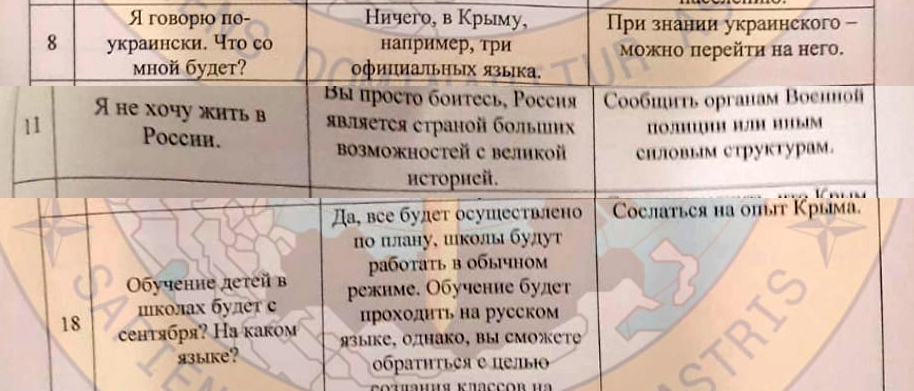 Дійсно, реальною думкою школярів та їхніх батьків ніхто не цікавився − російську мову нав’язали їм за замовчуванням. Яскравим свідченням того, наскільки «добровільним» є насправді вибір російської мови як основної мови навчання, є російська методичка, оприлюднена Головним управлінням розвідки Міністерства оборони України. У ній, зокрема, наведено типову відповідь на запитання громадян України з тимчасово окупованих територій про те, якою мовою буде здійснюватися викладання у школах.