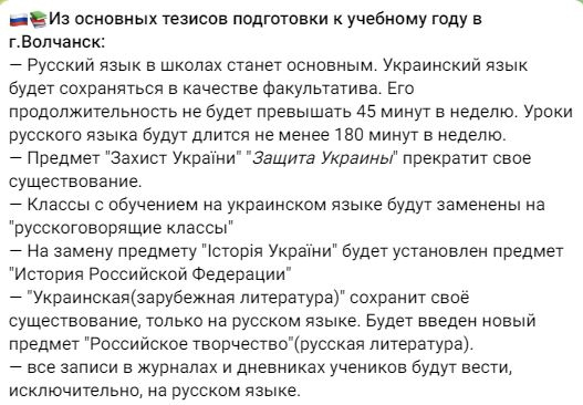 Про плани російських загарбників остаточно ліквідувати україномовну освіту красномовно свідчать повідомлення окупаційних адміністрацій. Наприклад, у тимчасово окупованому місті Вовчанськ Харківської області українську мову хочуть викладати винятково факультативно, причому приділятимуть цьому не більше як 45 хвилин на тиждень. Тоді як на викладання російської мови хочуть виділити щонайменше учетверо більше часу (180 хвилин), причому її вивчення буде не факультативним, а обов’язковим.