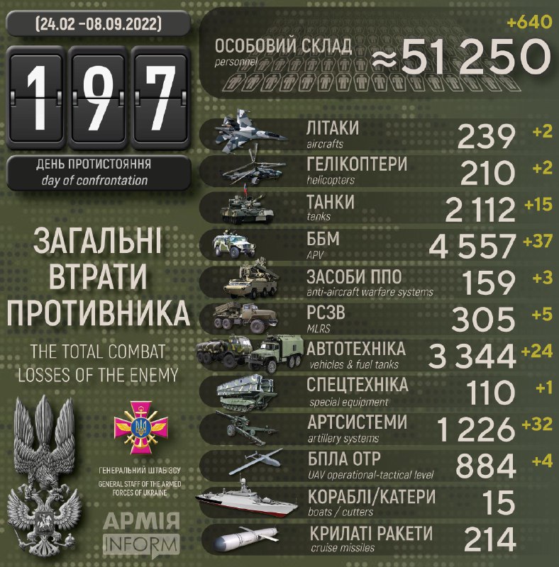 Загальні бойові втрати противника з 24.02 по 08.09 орієнтовно становлять: