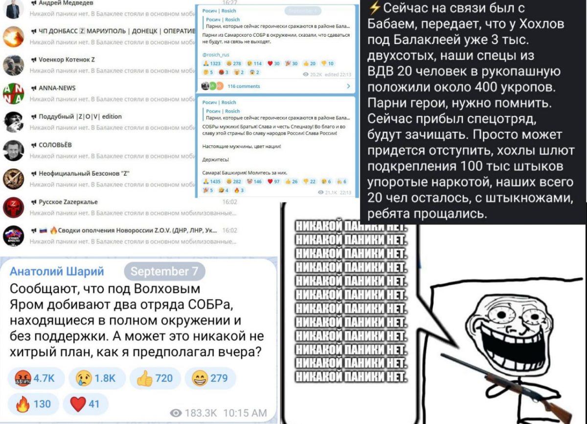 Наразі ці психічні метаморфози проходять російські нацисти – як цивільні, так і військові – через успіхи Збройних Сил України на фронті. Із втратою окупантами Балаклії та подальшого оточення рашистських загарбників істерика «побєдобєсів» у соцмережах вражає: шквал шизофренічних казок захлеснув чи не всі Z-смітники в соцмережах. Були і вигадки про «многахадовачку путіна», і про жести доброї волі, і про тактичний від’ємний наступ у зворотньому напрямку, і про студію Довженка. Але, на мій погляд, найкумеднішою була історія про неіснуючий «героїчний самарський СОБР».