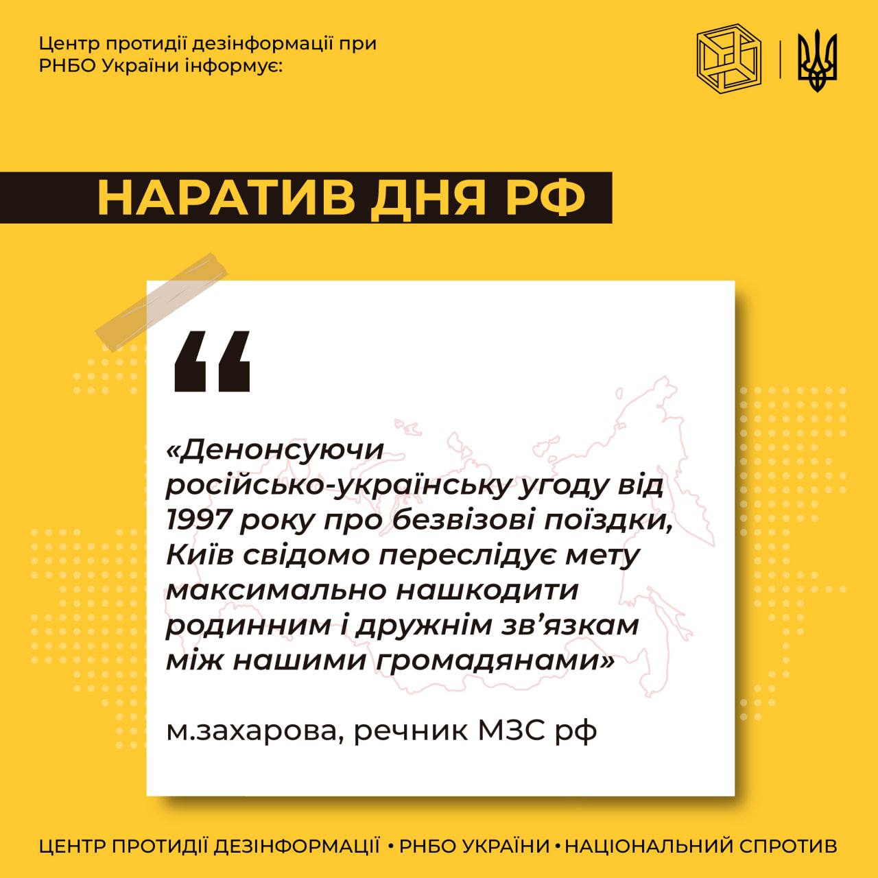 «Візові обмеження є елементом захисту від агресії рф з боку ЄС і України. Спрощений перетин кордонів потрібен рф для інформаційної експансії і внутрішньополітичного впливу та полегшує депортацію українців з ТОТ для покращення власної демографічної ситуації», – коментує реакцію рф на відміну спрощеного візового режиму ЄС із росією Центр протидії дезінформації при Раді національної безпеки і оборони.