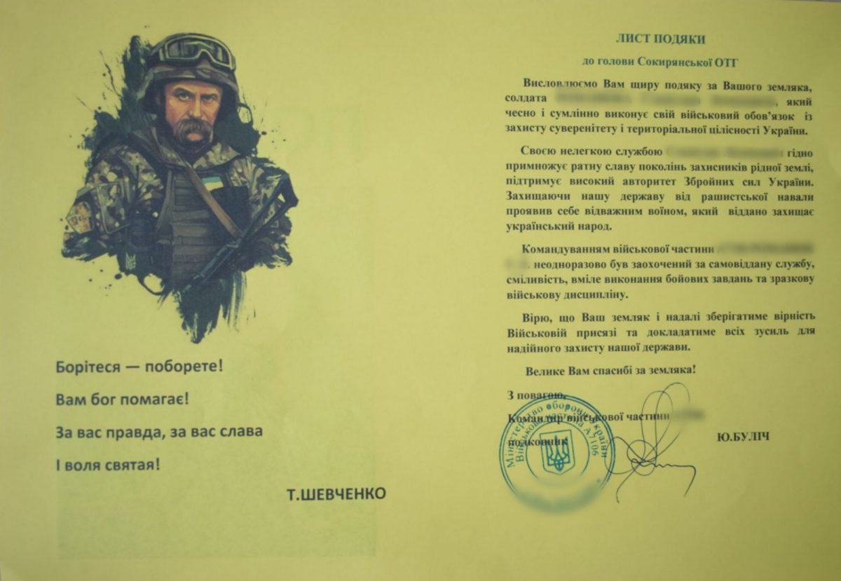 Уже не вперше на адресу Сокирянської міської ради Чернівецької області надходять листи подяки від командира однієї з військових частин Збройних Сил України, де несуть службу вихідці з Сокирянщини. Цього разу командування висловило вдячність за 5 військовослужбовців, які чесно і сумлінно виконують свій військовий обов’язок із захисту суверенітету і територіальної цілісності України. Відзначено захисників Ігоря П., Руслана М., Андрія Д., Володимира Я. та Павла Ф.