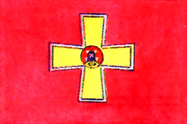 Рівнобічний чотирикутний жовтий хрест на вишневому тлі зображено і на полковому прапорі Ізюмської сотні. У його центрі — парсуна Ісуса Христа, який провіщає перемогу.