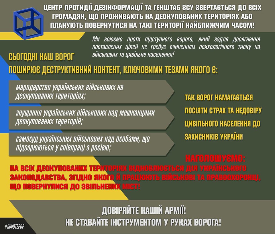 ЦПД та Генштаб ЗСУ звертається до всіх громадян, що проживають на деокупованих територіях або планують повернутися на такі території найближчим часом!