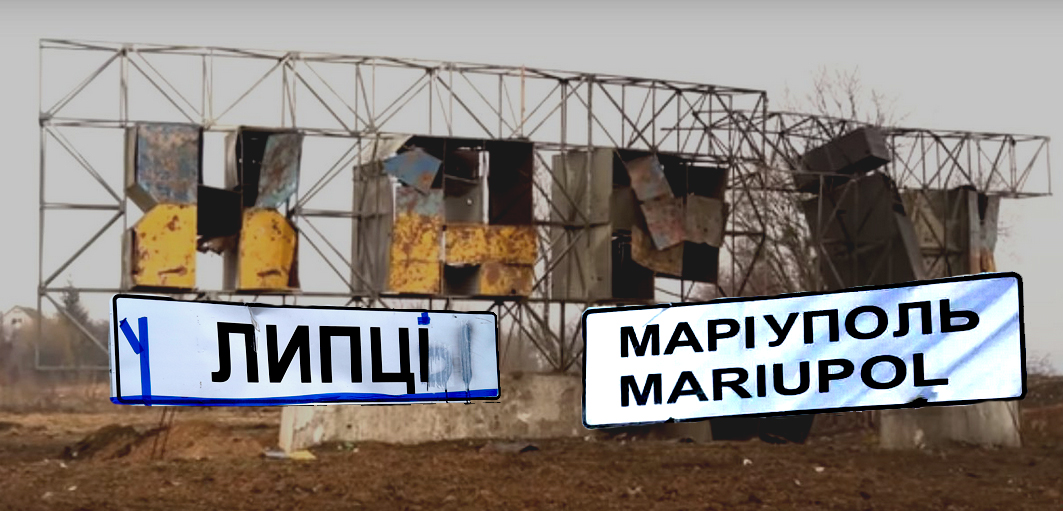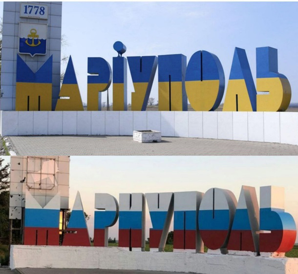 Свого часу мережу облетіли світлини з в’їзду до захопленого російськими окупантами Маріуполя. На них зафіксовано, як чоловіки у спецодязі комунальних служб замінюють дорожні знаки, прибираючи з них українську літеру «І» й замінюючи її на російське «И».