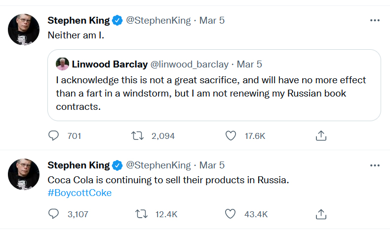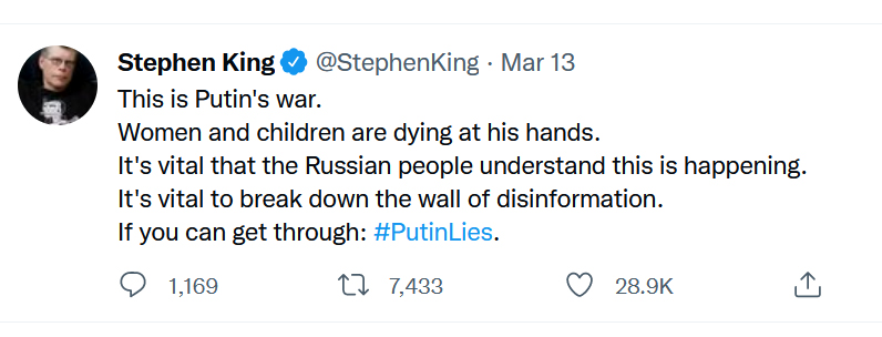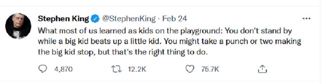 24 лютого Стівен Кінг опублікував твіт, в якому написав: «Чого більшість із нас навчилися, коли ми були дітьми на ігровому майданчику: не можна стояти осторонь, поки велика дитина б’є маленьку. Можливо, ви отримаєте кілька ударів, намагаючись змусити велику дитину зупинитися, але це правильний вчинок».