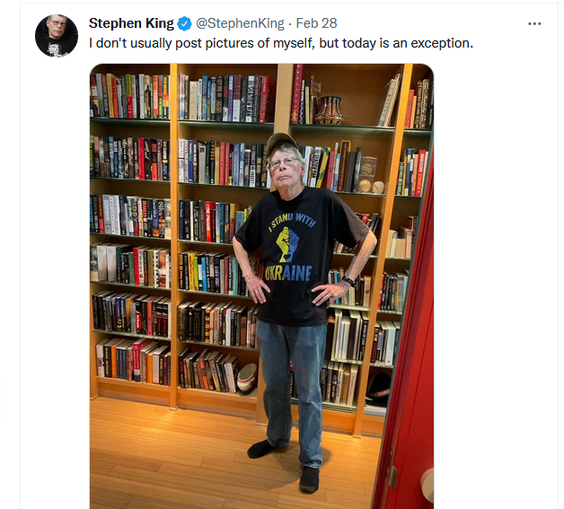А вже 28 лютого письменник висловився відвертіше, опублікувавши власну світлину у футболці з написом I Stand With Ukraine («Я підтримую Україну»). «Зазвичай я не публікую своїх фотографій, але сьогодні виняток», — написав він. Саме це фото привернуло максимальну увагу до позиції Стівена Кінга й надалі ЗМІ не пропускали вже жодного його твіта з приводу України.