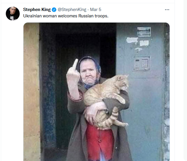 Яскравим став твіт зі світлиною літньої українки, яка, за словами Стівена Кінга, зустрічає російські війська на порозі власного будинку характерним жестом.