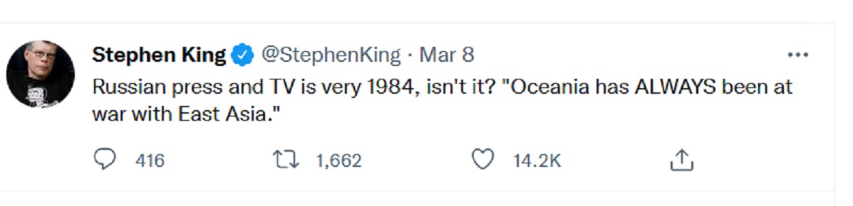А вже 8 березня письменник порівняв російські пропагандистські ЗМІ і телебачення з пресою та телебаченням зі знаменитого роману-антиутопії Джорджа Орвелла «1984». «Російська преса й телебачення дуже нагадують «1984», чи не так? “Океанія ЗАВЖДИ воювала зі Східною Азієюˮ», — написав Стівен Кінг.