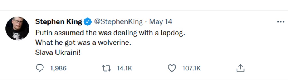 Мабуть, найвідомішим став твіт Стівена Кінга, в якому він порівняв Україну з росомахою. «Путін думав, що має справу з болонкою. Те, з чим він зіткнувся, виявилося росомахою. Слава Україні!», — написав він 14 травня. Це неймовірно влучне порівняння, гідне справжнього майстра слова. Росомаха вважається надзвичайно лютим хижаком, неперевершеним за силою серед ссавців свого розміру. Ця тварина спроможна дати переможний бій навіть ведмедю. За словами очевидців, траплялися випадки, коли безстрашний звір проганяв значно більших за неї хижаків від їхньої здобичі.