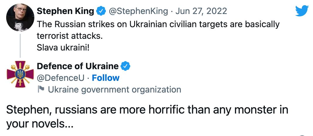 Внесок Стівена Кінга настільки вагомий, що йому відповідає навіть офіційний акаунт Міністерства оборони України. Так, 27 червня письменник зазначив: «Російські удари по цивільних об’єктах в Україні є фактично терористичними атаками. Слава Україні!». «Стівене, росіяни жахливіші за будь-якого монстра з ваших романів», — відповів йому офіційний акаунт Міністерства оборони України.