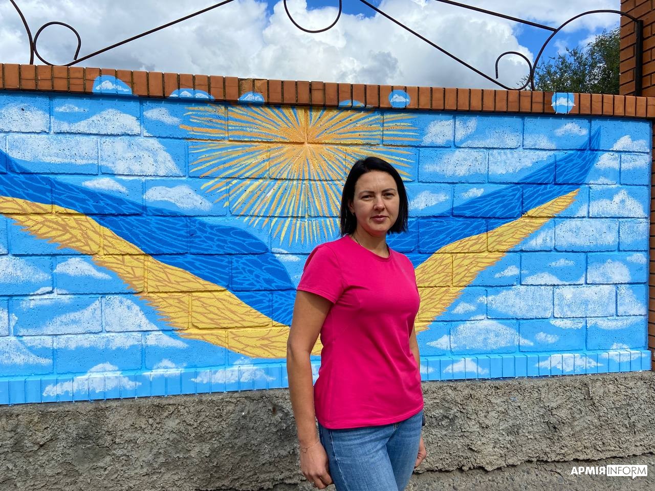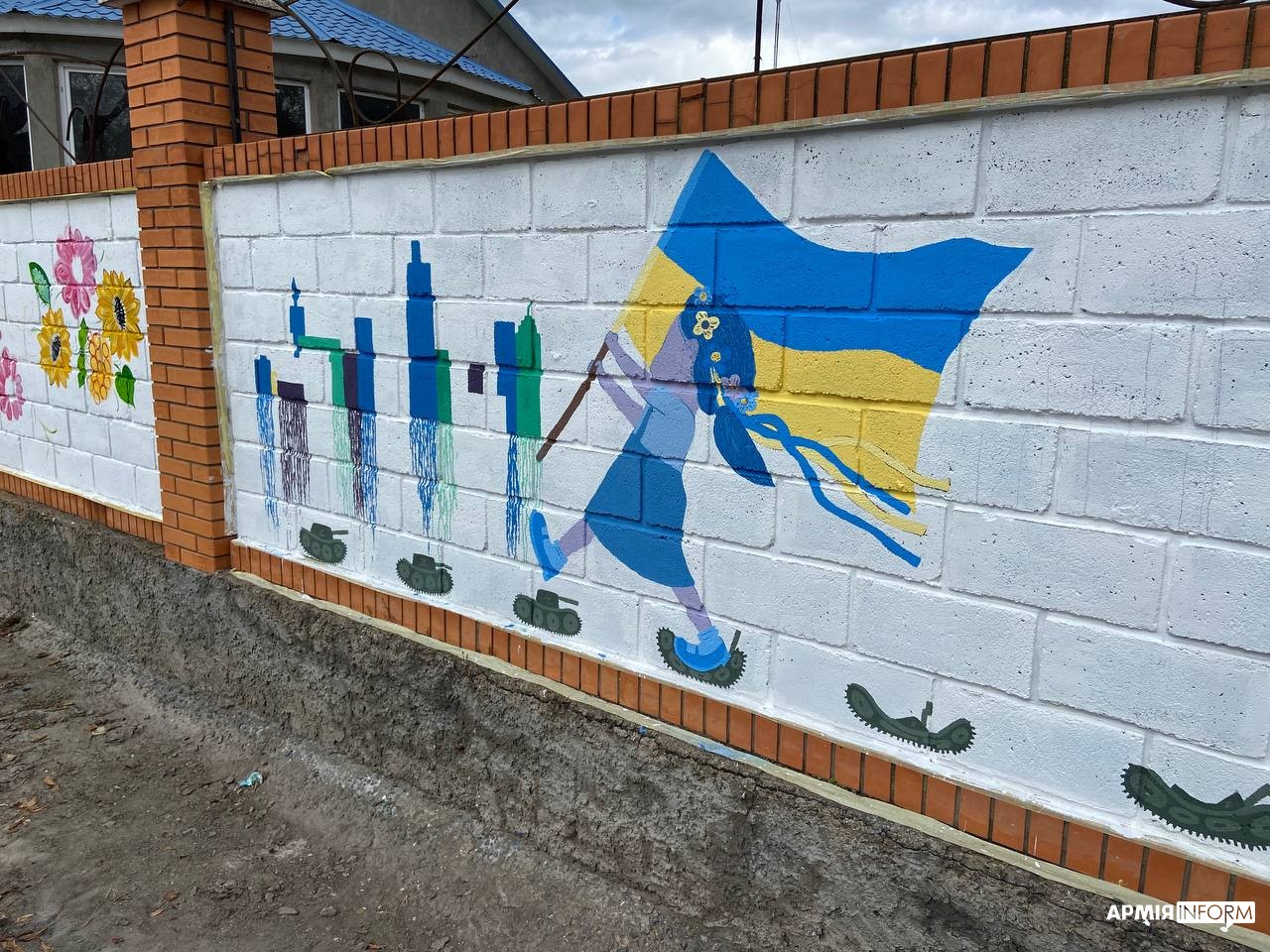 Крила янгола на тлі державного прапора, барвисті квітки українського орнаменту та маленька дівчинка, яка, наче тарганів, чавить танки окупантів — таке графіті не могло не привернути увагу до паркану в одному з прифронтових селищ Дніпропетровщини. А поряд, біля іншого такого ж імпровізованого полотна, старанно працювала ще одна художниця та вимальовувала акуратні пелюсточки петриківським соняхам. Вона й розповіла, що ініціативні мешканці громади намагаються всіляко демонструвати свою українську ідентичність і підтримувати наші Збройні Сили.