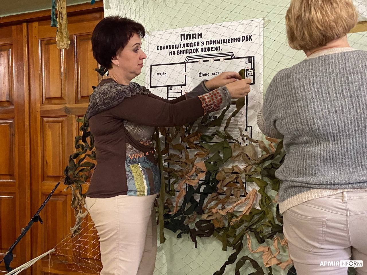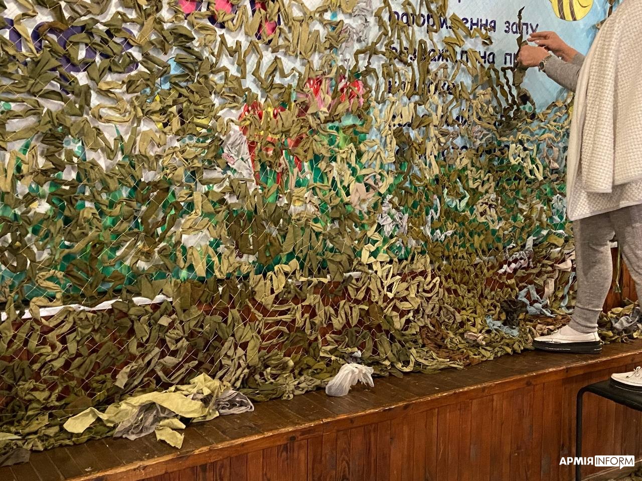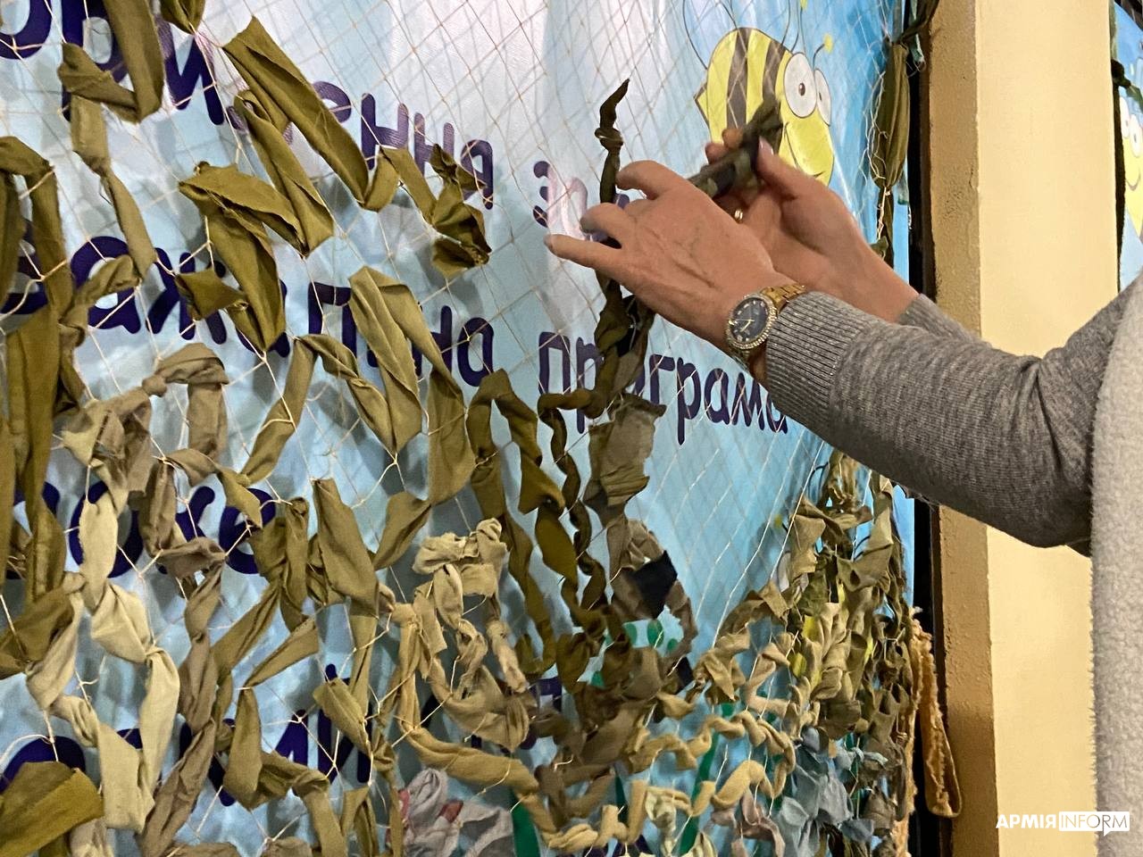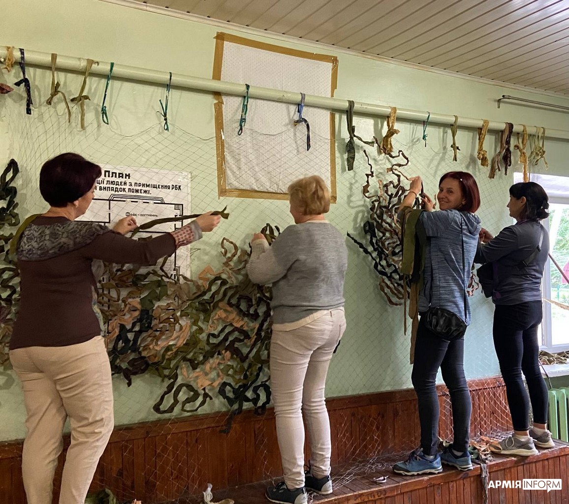 Патріотичний графіті-паркан — це не єдиний проєкт мешканців селища. В одному з приміщень група моторних та охочих до розмови місцевих жіночок плела маскувальні сітки.