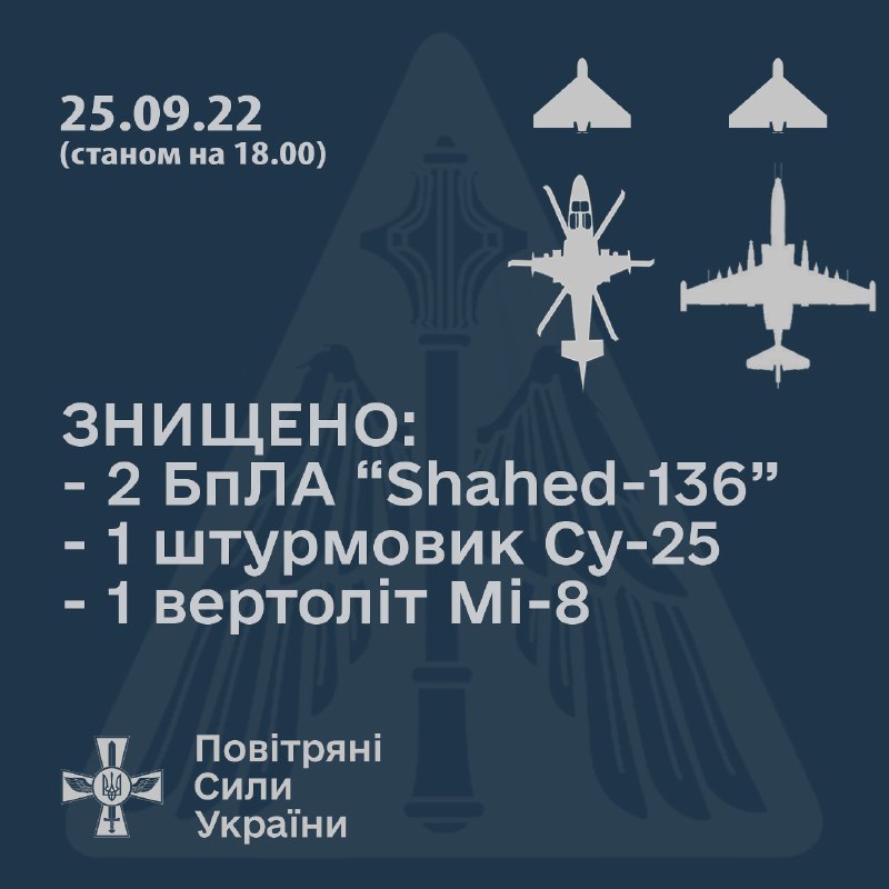 «25 вересня близько 17.00 години підрозділами зенітної ракетної Одеської бригади повітряного командування “Південь” збито ворожий штурмовик Су-25, який атакував наші війська на Херсонщині. Для порятунку російського пілота окупанти відправили вертоліт Мі-8 з командою на борту, який теж успішно знищений зенітниками Одеської бригади. За поточну добу підрозділами протиповітряної оборони Повітряних Сил також збито два безпілотники-камікадзе «Shahed-136» на Миколаївщині та Одещині. Б’ємо цю погань щодня і щогодини! Разом – до перемоги!», – йдеться у повідомленні.