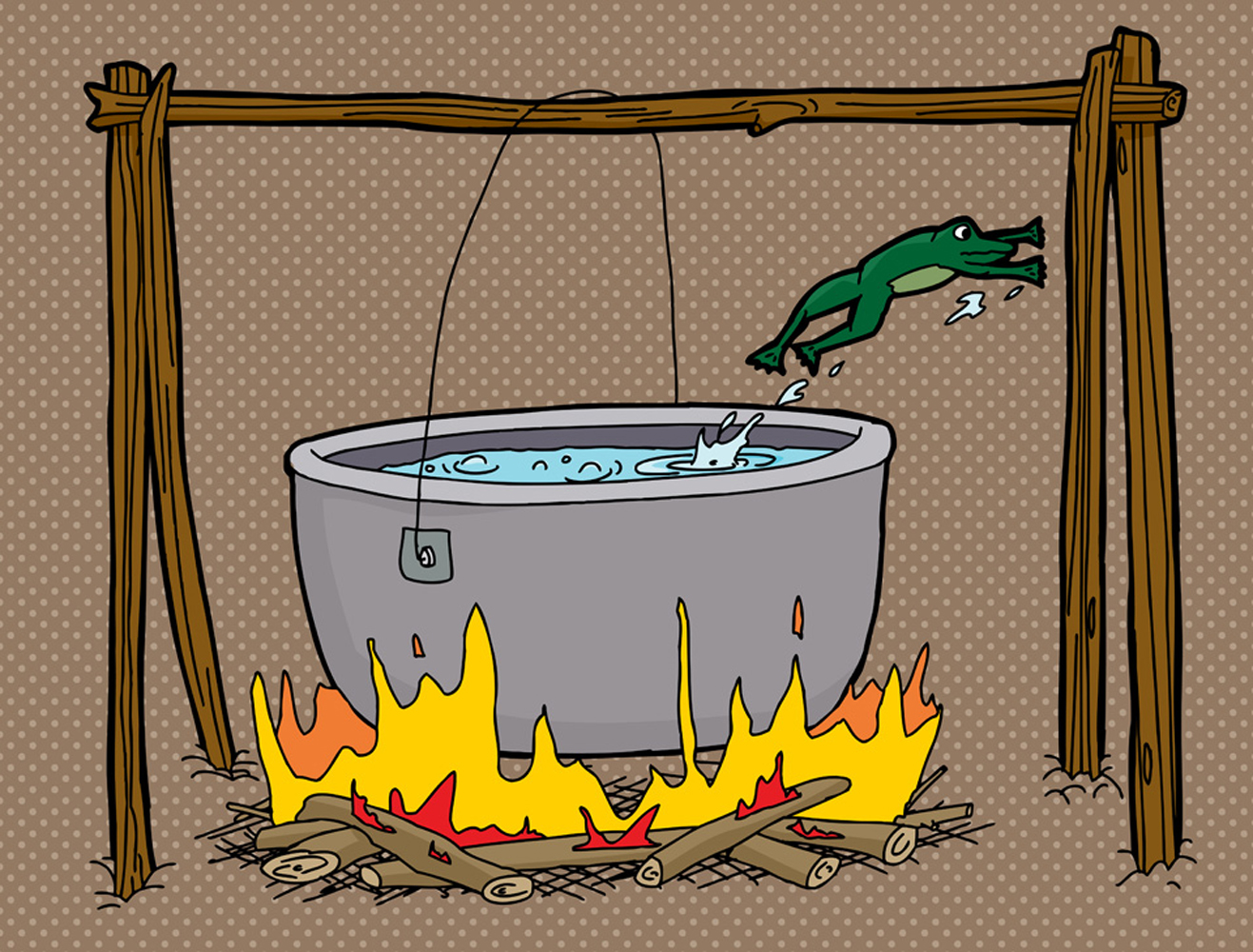 Доля російського суспільства нагадує сумну історію про жабу, яку посадили в баняк з холодною водою і почали потроху підігрівати. Не помічаючи надто повільних змін навколо себе, жаба, замість того щоб вистрибнути, зрештою опинилася в окропі і зварилася.