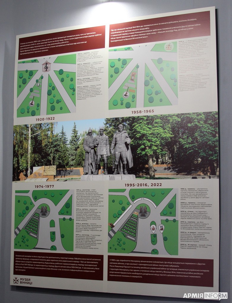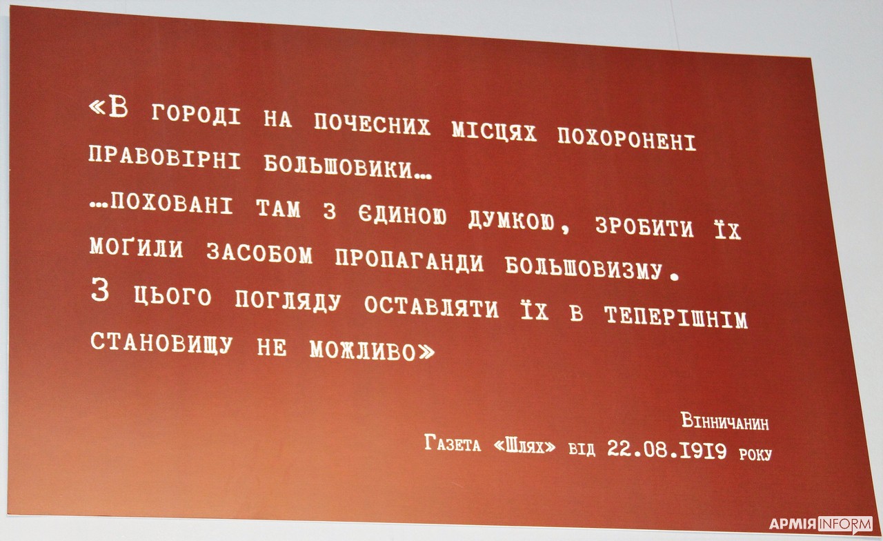 — Тривалий час радянська влада, а пізніше посткомуністичні очільники Вінниці розповідали, що на Меморіалі Слави поховані герої, що звільняли місто від німецько-фашистських загарбників. Але це лише частково так. Тому насамперед ми хочемо донести правду про те, що цей Меморіал присвятили й таким «героям», які з точки зору сучасної моралі є фактично злочинцями щодо українців, — прокоментував кореспондентці АрміяInform заступник директора Музею Вінниці з виставкової роботи Євген Сафар’янс. — Тут поховані і сюди перепоховані ті, хто вбивав наших предків-селян, відбирав у них їжу, майно в 1920-30-х. Ті, хто репресував поляків, євреїв, українців і навіть росіян, які жили на Вінниччині, у 1937-38 роках.