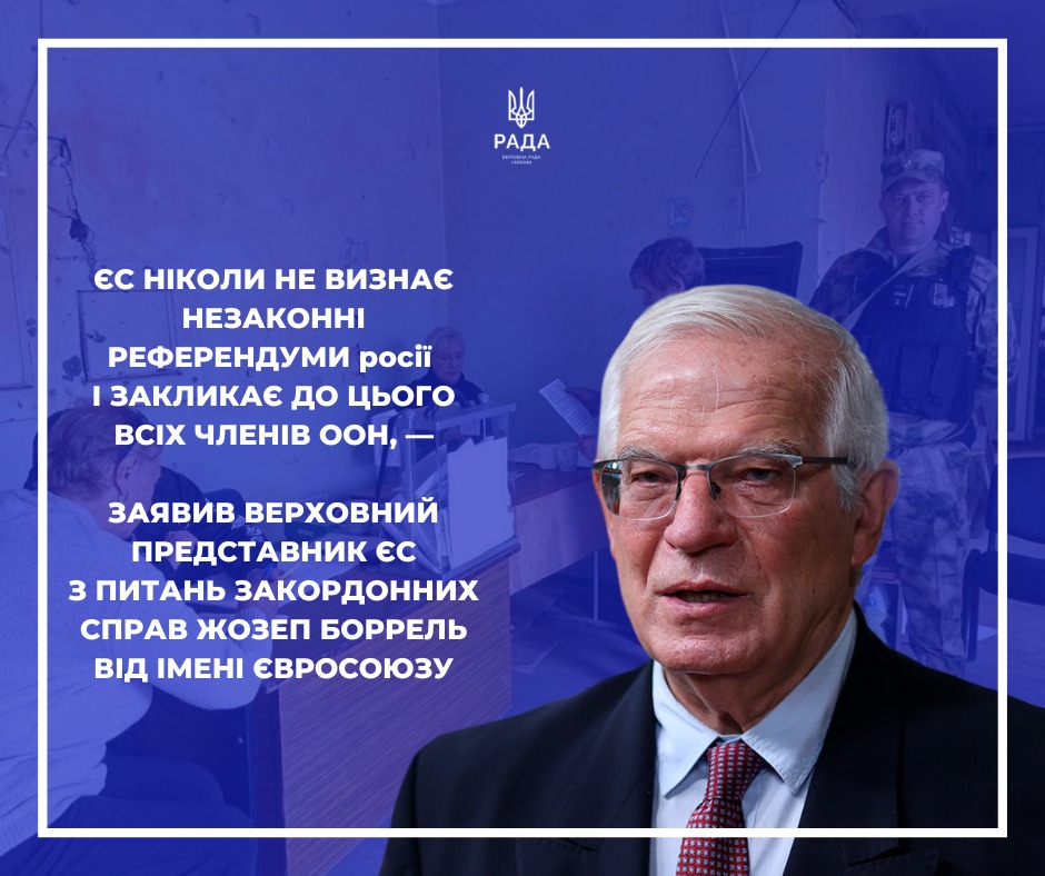 Європейський Союз якнайрішучіше засуджує незаконні фіктивні референдуми, проведені в частинах Донецької, Запорізької, Луганської та Херсонської областей України, що тимчасово та частково окуповані росією, — заявив від імені Євросоюзу Верховний представник ЄС з питань закордонних справ і політики безпеки Жозеп Боррель.