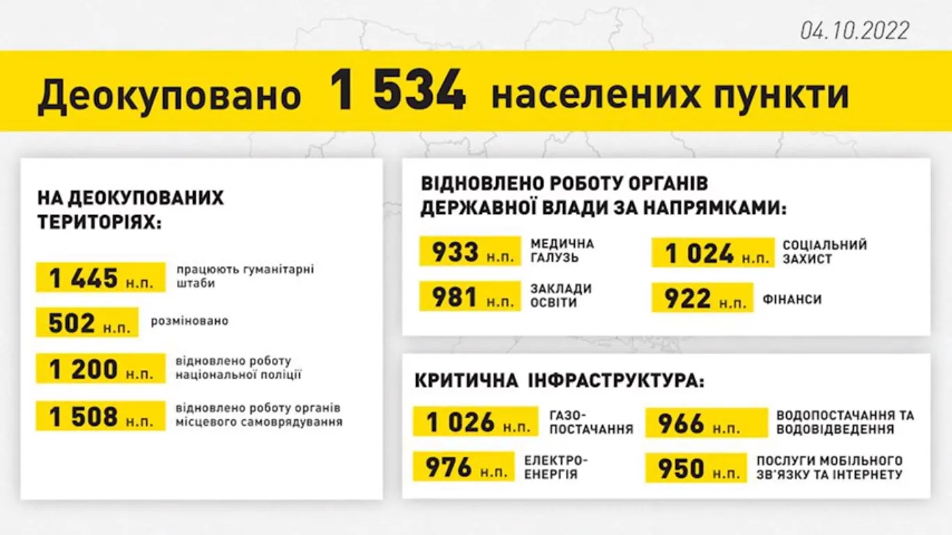 Від початку повномасштабної російської військової агресії Силами оборони України деокуповано 1534 населених пункти. З них 483 населених пункти – на Харківщині.