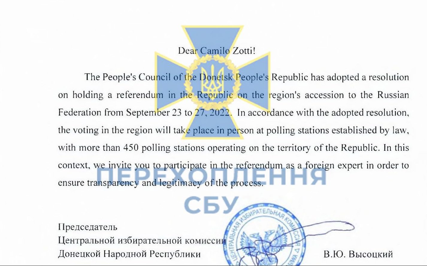 У ході оперативної роботи виявлено зразки запрошень «іноземних спостерігачів» щодо участі у незаконному плебісциті на сході України.