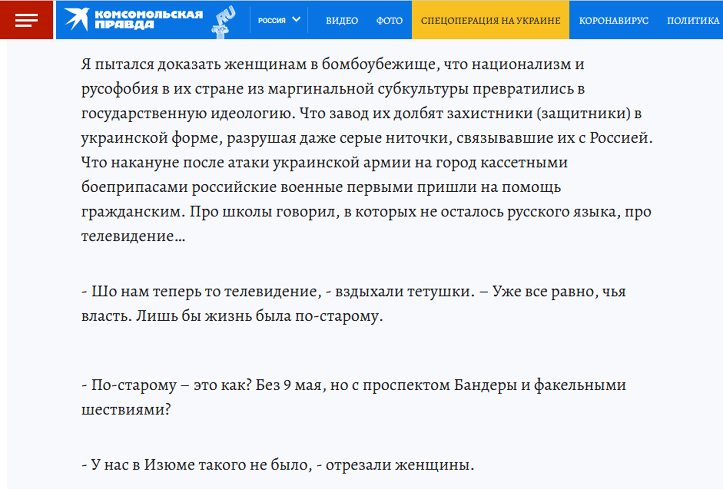 Наведений на скриншоті статті рашистського пропагандиста діалог — дуже показовий. Він намагається переконати українок вірити не власним очам і попередньому досвіду, а брехливій пропаганді. І зазнає повної поразки, в чому сам відверто зізнається.