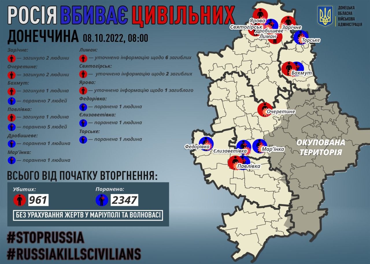 За 7 жовтня росіяни вбили 6 мирних жителів Донеччини: 2 у Зарічному, 2 в Очеретиному, 1 у Бахмуті та 1 у Павлівці.