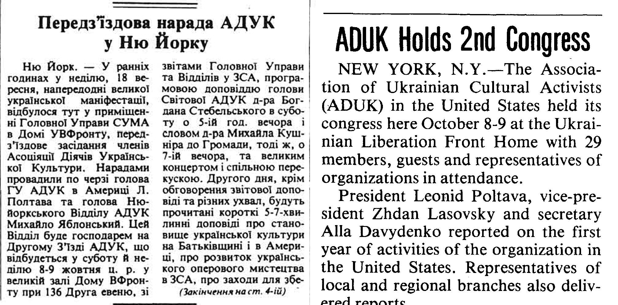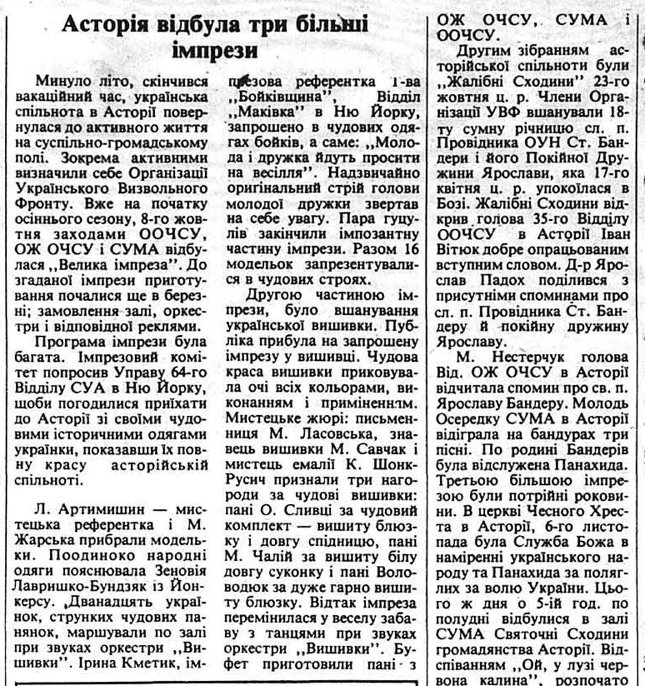 Найважливішими з них стали конгрес Асоціації Діячів Української Культури в США, вишукана й представницька імпреза традиційного українського одягу та вишивки в Асторії, концерти ансамблів «Боян» і «Калина» та інші.