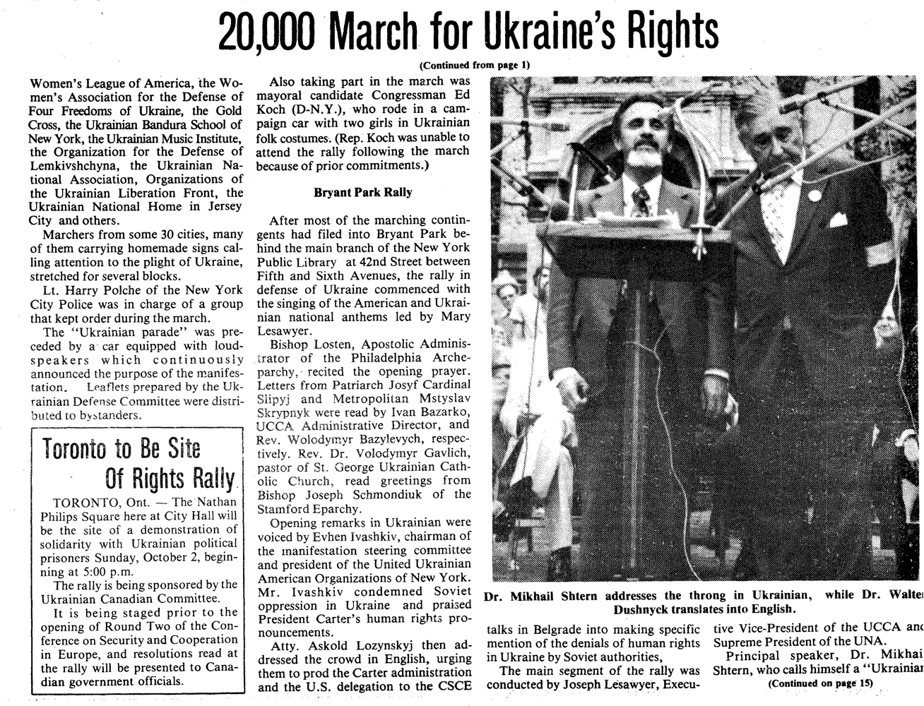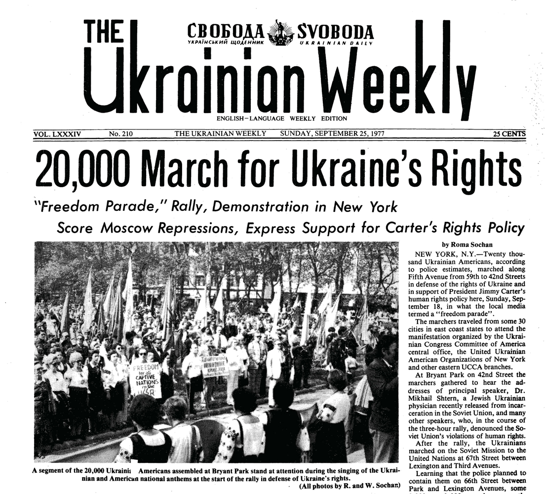 Осягнути масштаби повсякчасної праці українців діаспори на користь України, її народу та культури дозволяє, наприклад, велелюдний «Парад Свободи» — хід за права українців у Нью-Йорку 18 вересня 1977 року, в якому взяли участь понад 20 тисяч учасників із 30 міст Америки. Виголошені та обстоювані на тому заході вимоги звучать актуально й нині, особливо з огляду на прагнення кремля знищити незалежну Україну й український народ.