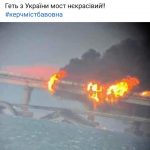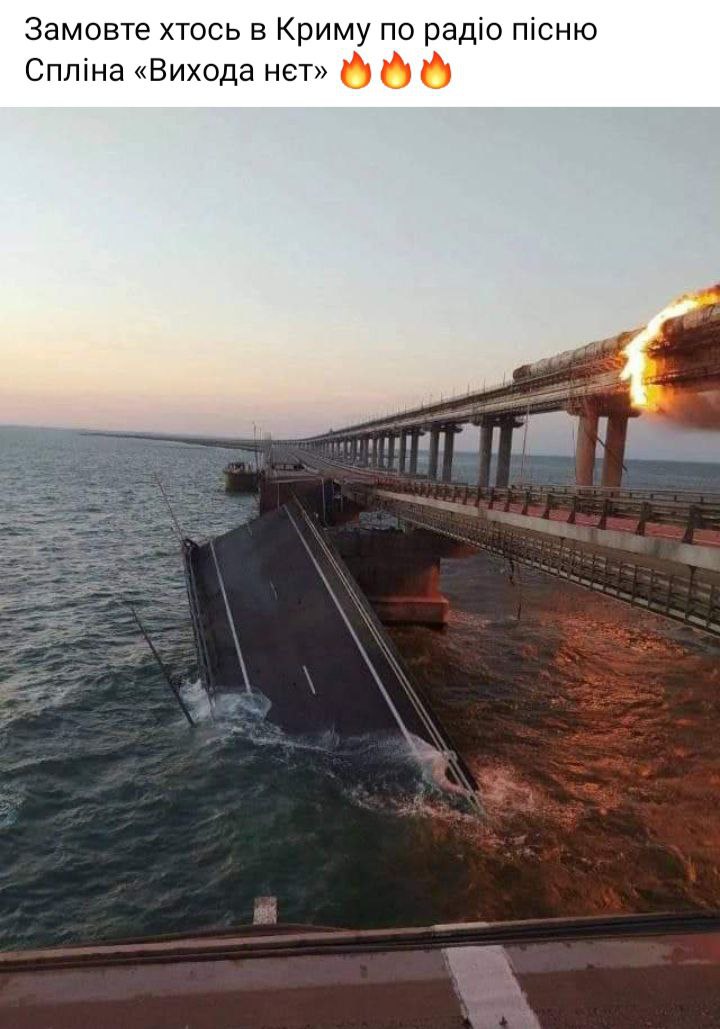 Нагадаємо, за інформацією російських ЗМІ, сьогодні близько шостої години ранку на мосту, який поєднує анексований український Крим з материковою частиною росії, пролунала «бавовна». Пошкоджено автомобільне полотно, зупинено залізничне сполучення, горять цистерни з пальним.