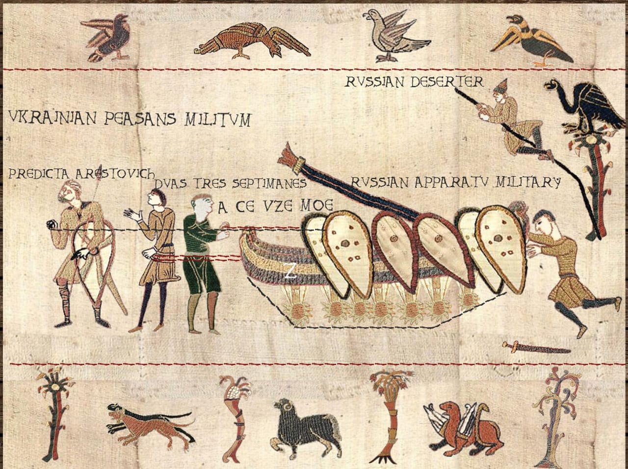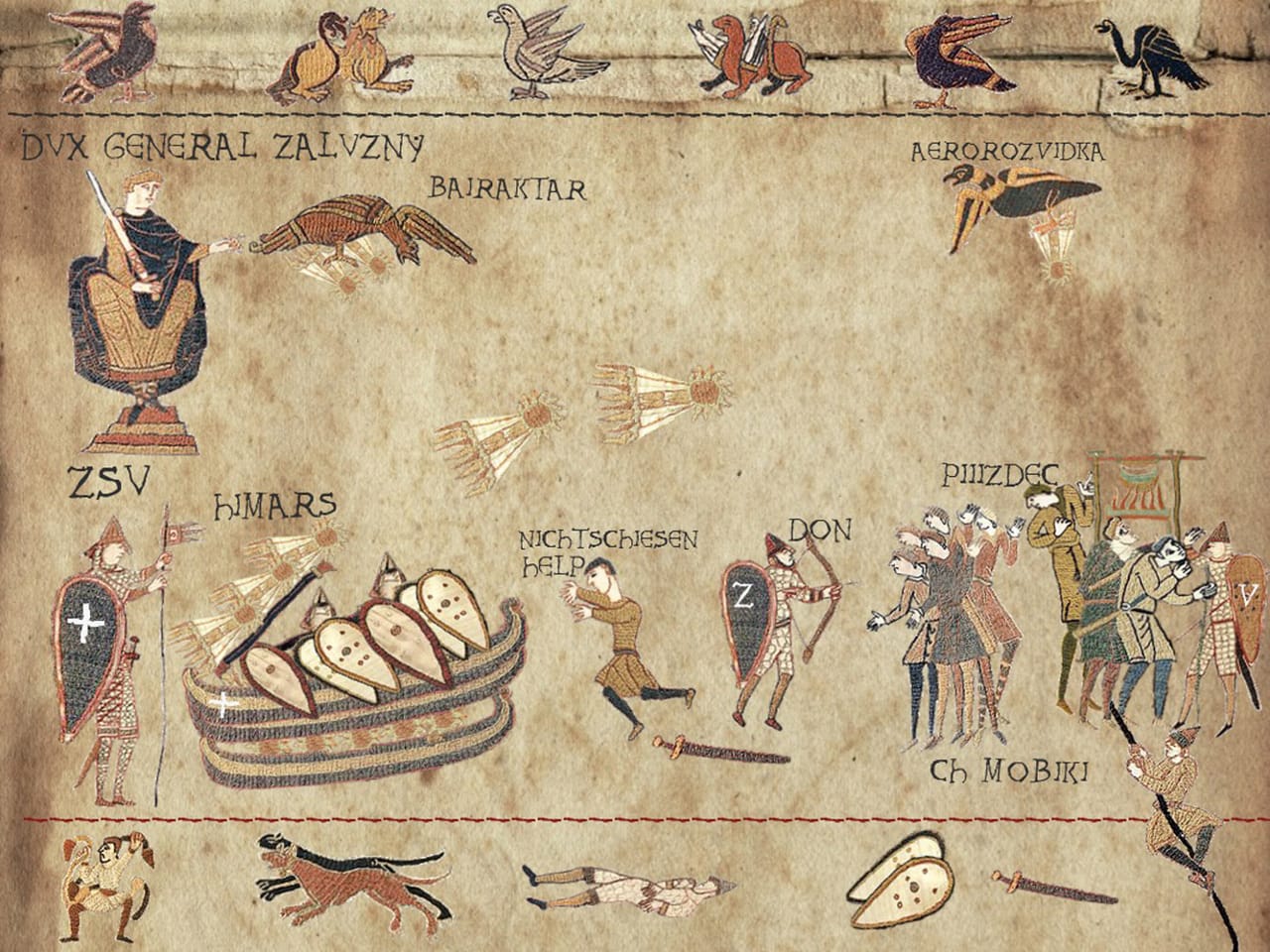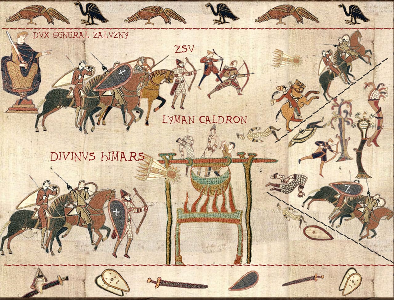 — Насправді комп’ютерна програма для створення зображень на основі цього знаменитого середньовічного гобелена добре і давно відома. Однак нині якось її трохи призабули, а я от згадав і вирішив створити серію коміксових картинок у середньовічному стилі про сучасні події. Щоправда, кількість фігурок-«юнітів», з яких можна створювати зображення, у програмі обмежена. Тому довелось вигадувати і комбінувати, щоб меми урізноманітни.