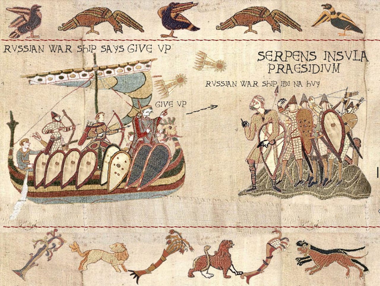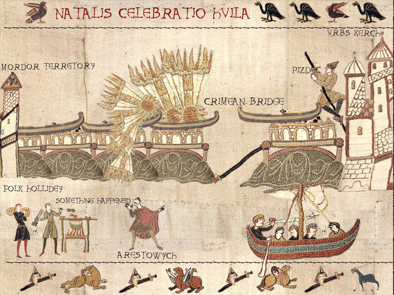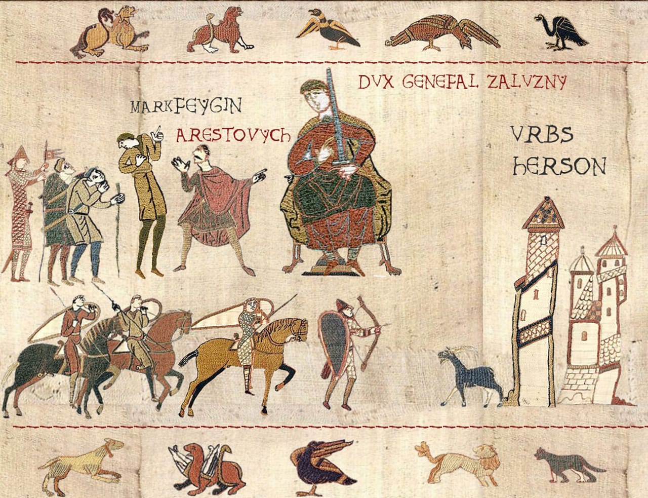 — Насправді комп’ютерна програма для створення зображень на основі цього знаменитого середньовічного гобелена добре і давно відома. Однак нині якось її трохи призабули, а я от згадав і вирішив створити серію коміксових картинок у середньовічному стилі про сучасні події. Щоправда, кількість фігурок-«юнітів», з яких можна створювати зображення, у програмі обмежена. Тому довелось вигадувати і комбінувати, щоб меми урізноманітни.