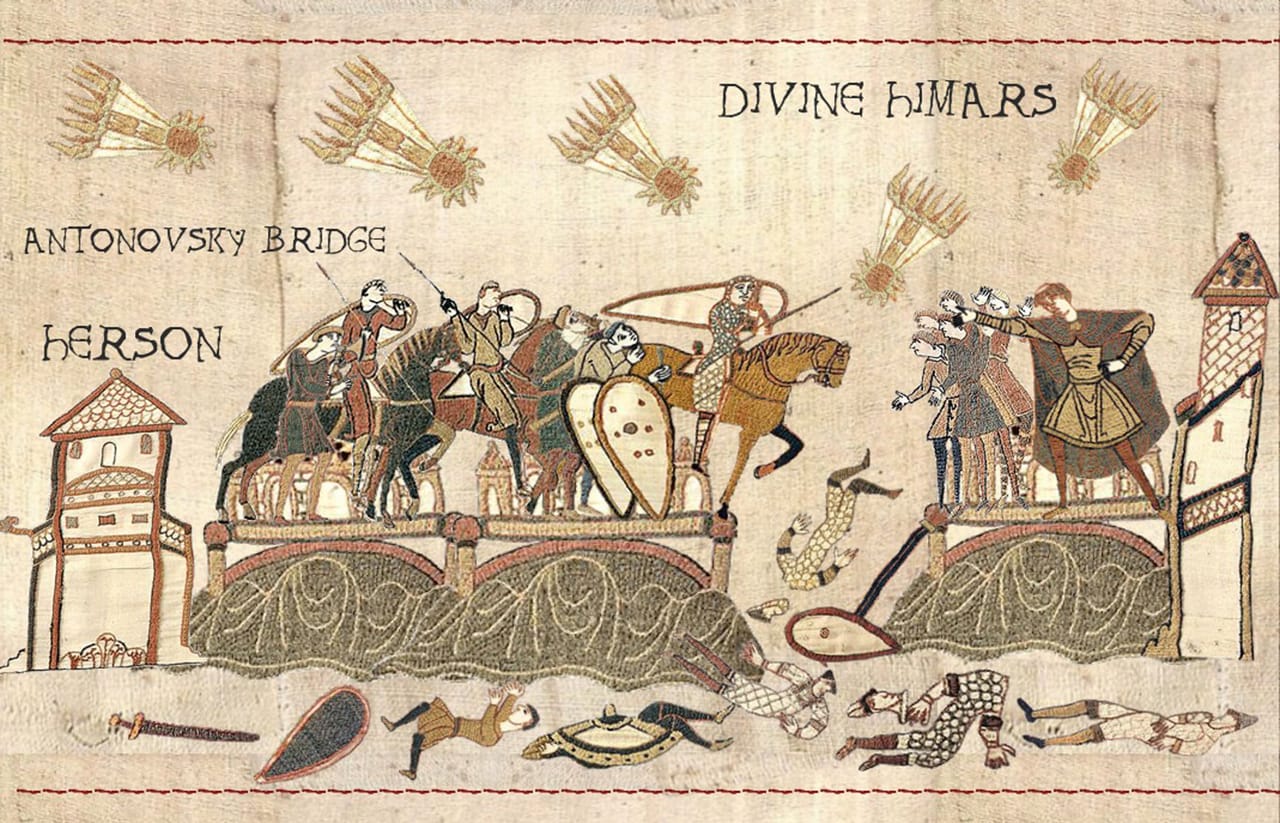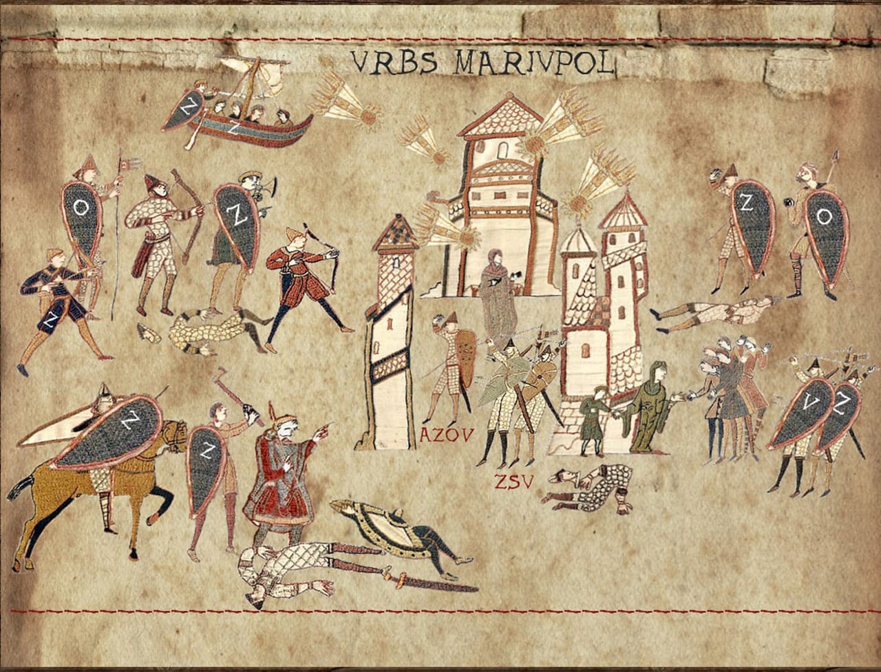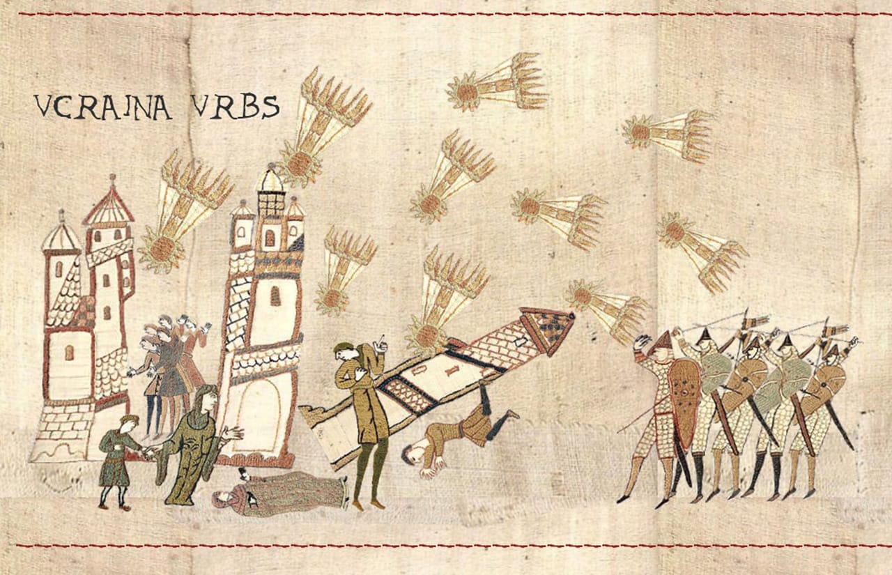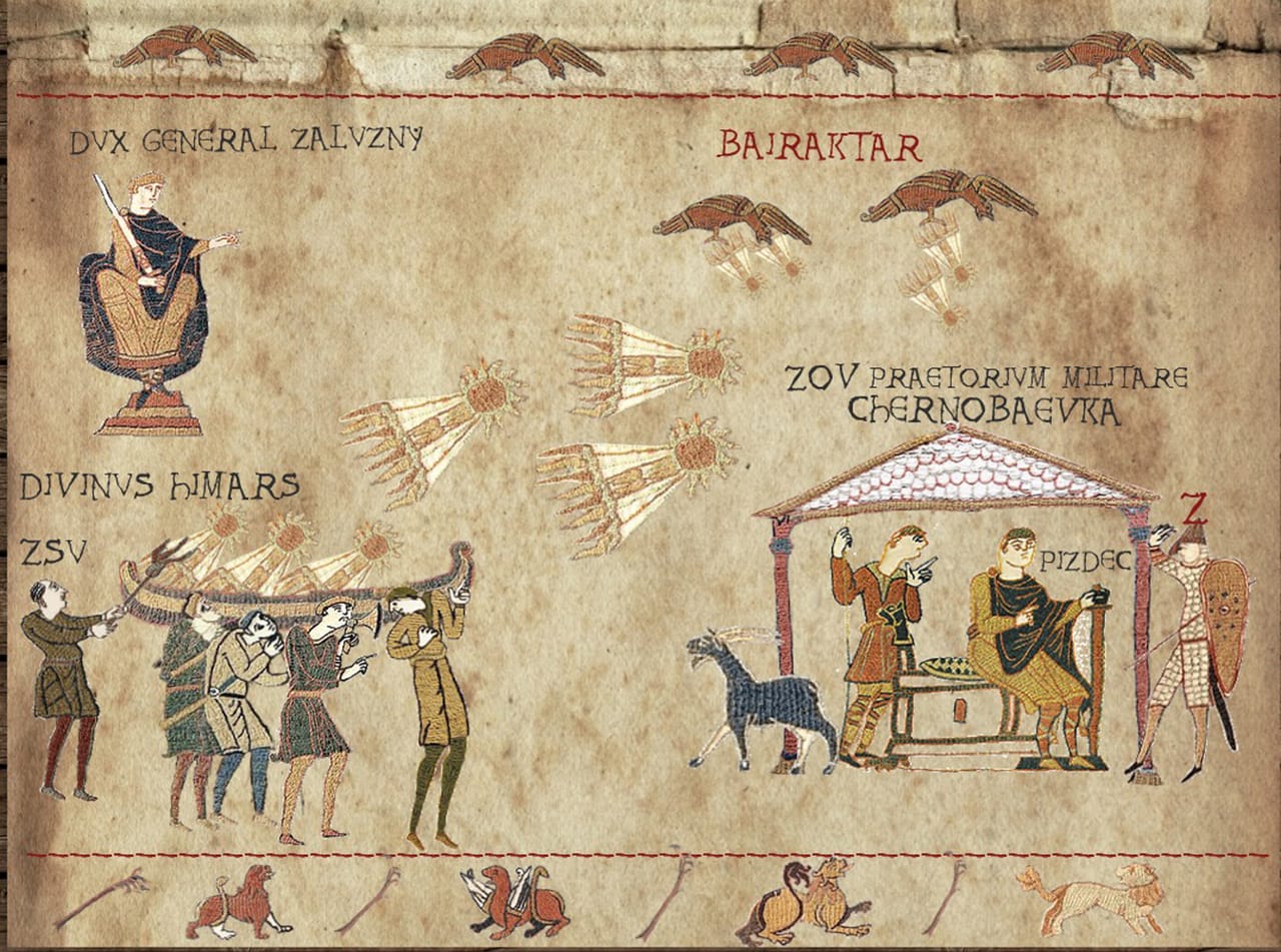Для цього довелося вмикати фантазію, малювати і підписувати зображення так, щоб відразу було зрозуміло, що саме зображено і чому такий підпис. Завдяки цьому виходить такий легкий комікс у середньовічній стилістиці, який з доволі обмеженою кількістю фігурок і буквально кількома словами тексту дозволяє проілюструвати важливі події. У реальному часі вони, до речі, могли тривати від кількох годин чи діб до тижнів, чи навіть місяців. Ось, наприклад, зображення обстрілів України російськими ракетами — воно почалося від ранку 24 лютого і триває до сьогодні. Тому це, на жаль, універсальна картинка, одна з найсумніших.