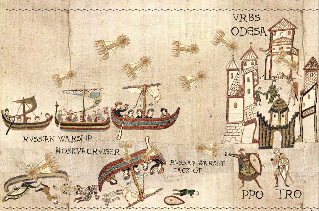 А часом, як і за доби Середньовіччя, на одному зображенні одномоментні події поєднуються з тривалими процесами. Таким, наприклад, є зображення обстрілів росіянами Одеси і потоплення тієї ж «москви».