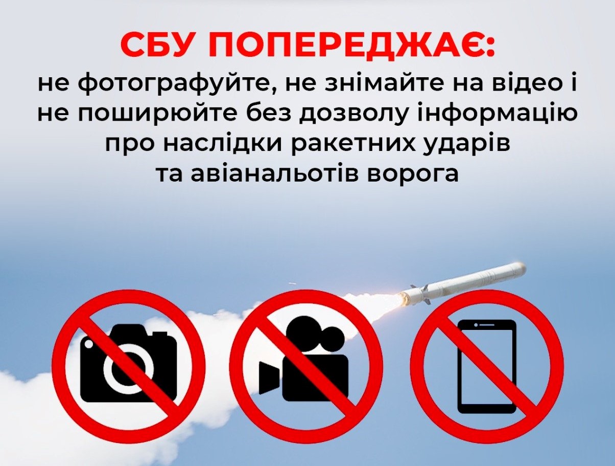 У зв’язку з масованим ракетним обстрілом України російськими терористичними військами нагадуємо, що розповсюдження відео та фото шкодить обороноздатності нашої держави та створює загрозу повторних обстрілів противника з більш руйнівними наслідками влучань.