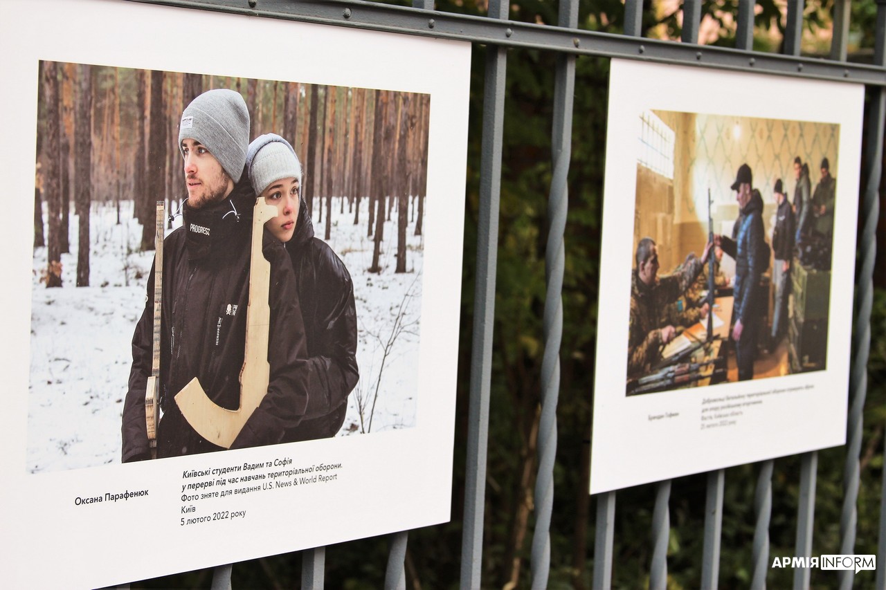 За словами однієї із авторок світлин Оксани Парафенюк, дуже важливо не забувати, що відбувається сьогодні в Україні. На виставці представлені кілька робіт фотографки. Одна із них – портрет молодих людей під час тренувань територіальної оборони 20 лютого.