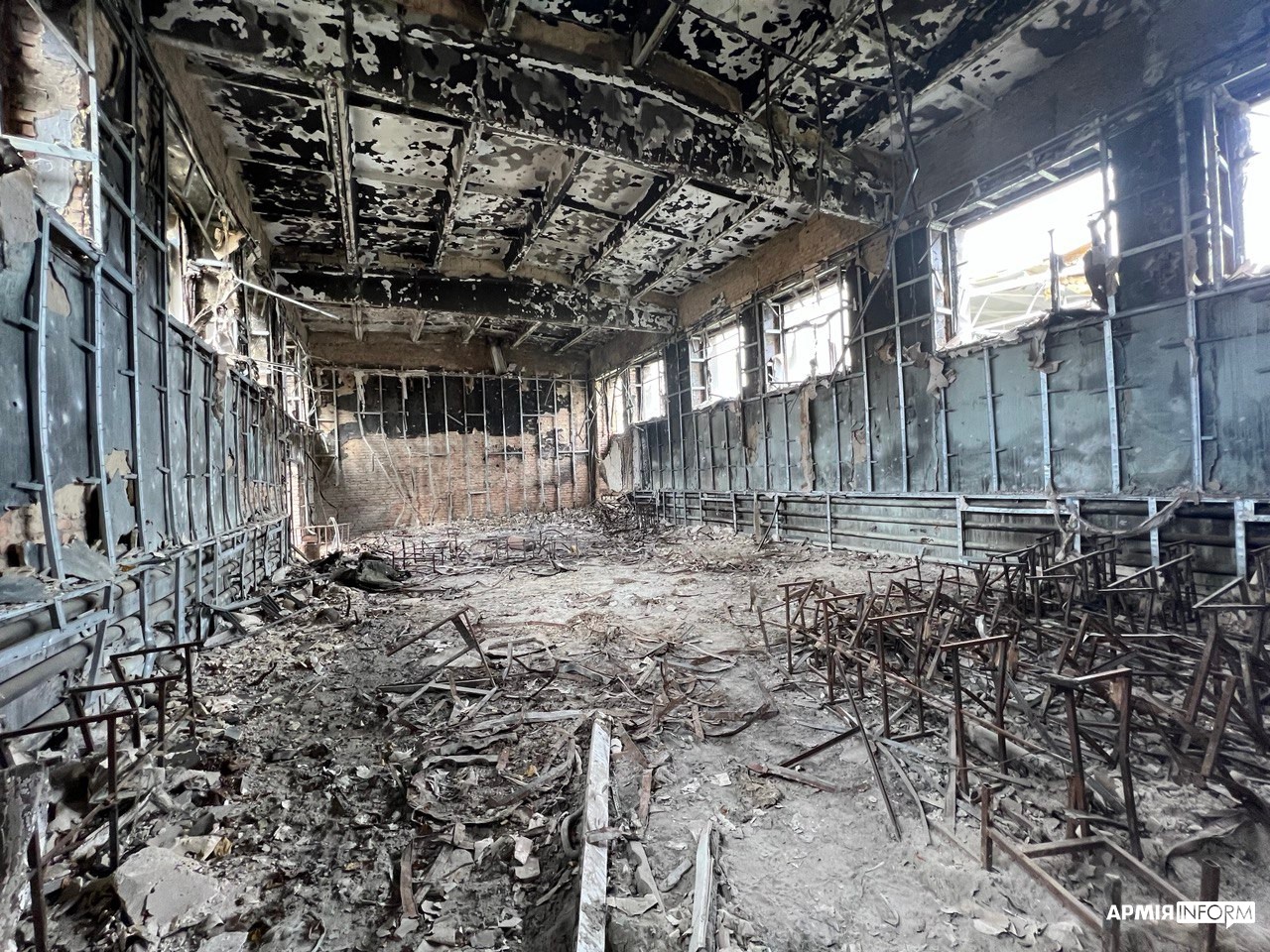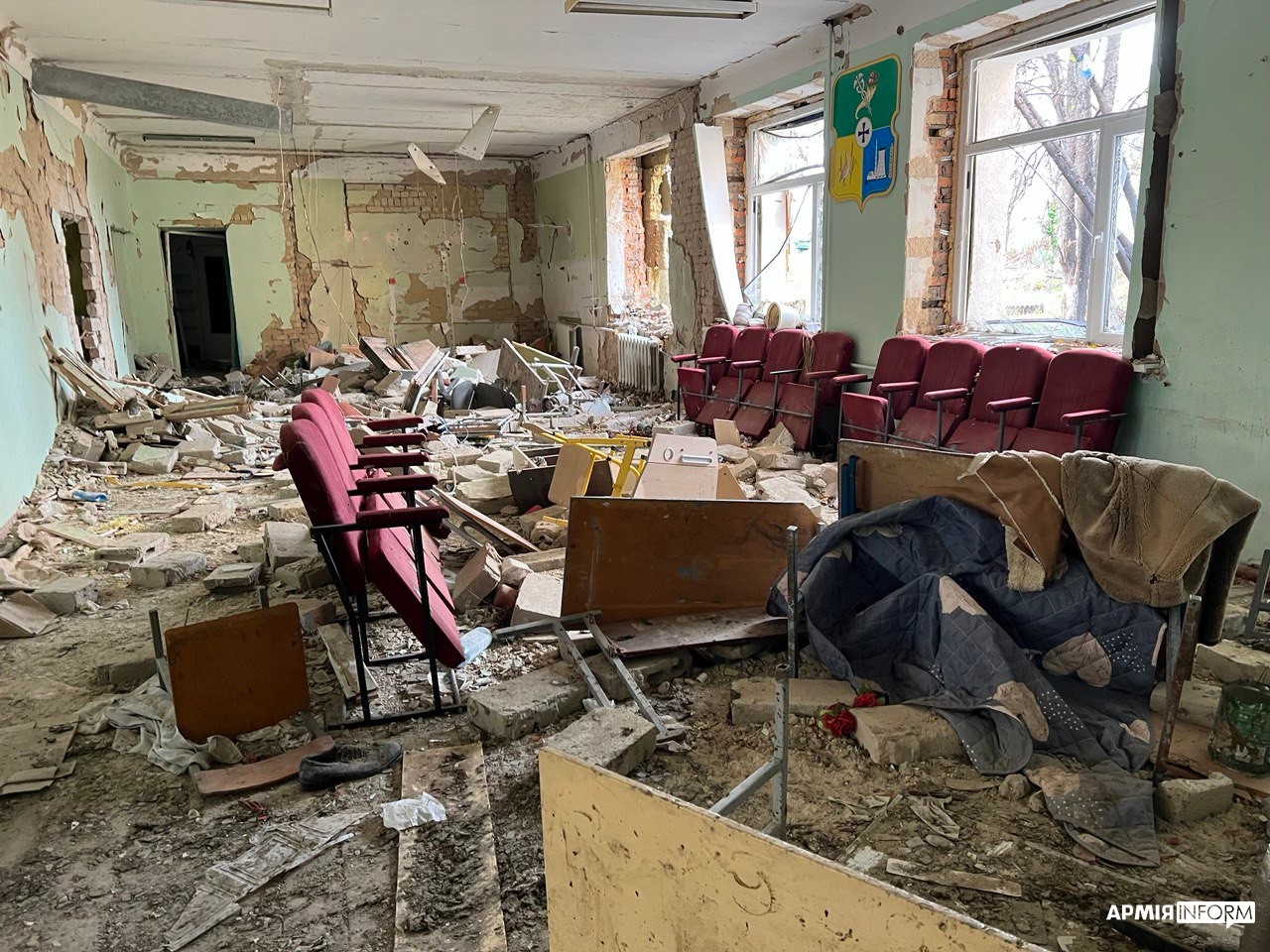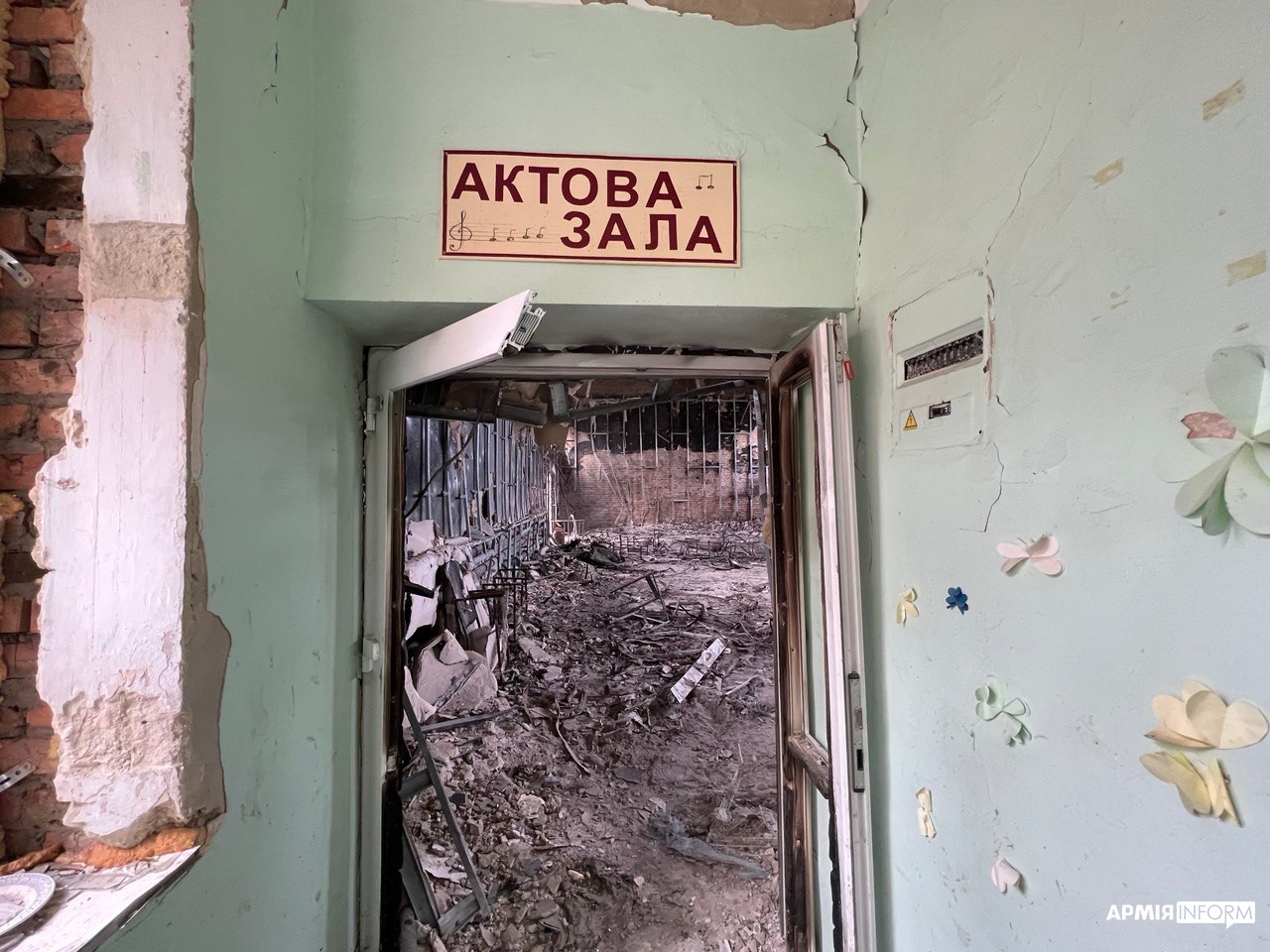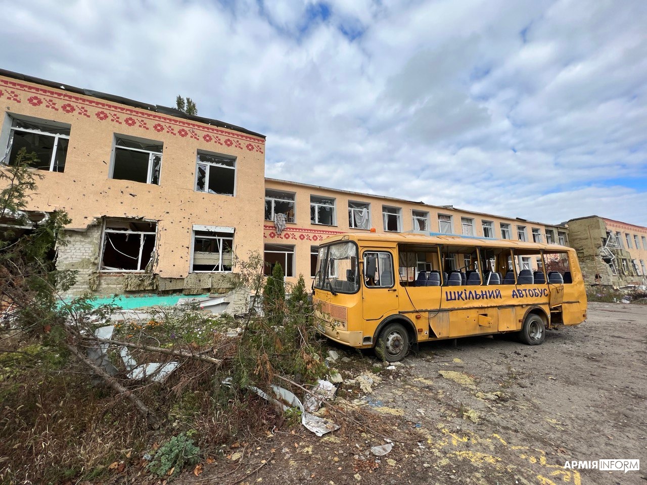 Ще одна моторошна картинка в селищі — це ліцей, який ворог просто зрівняв із землею. Вибиті вікна, розкидані підручники, на підлозі також − двері. На одних написано «другий клас». Повсюди купа російського майна, починаючи від сухпаїв і закінчуючи вибухонебезпечними «подарунками». Спалена вщент актовазала теж є рукою «русскаго міра», яка, здається, стиснула в кулак усе селище.